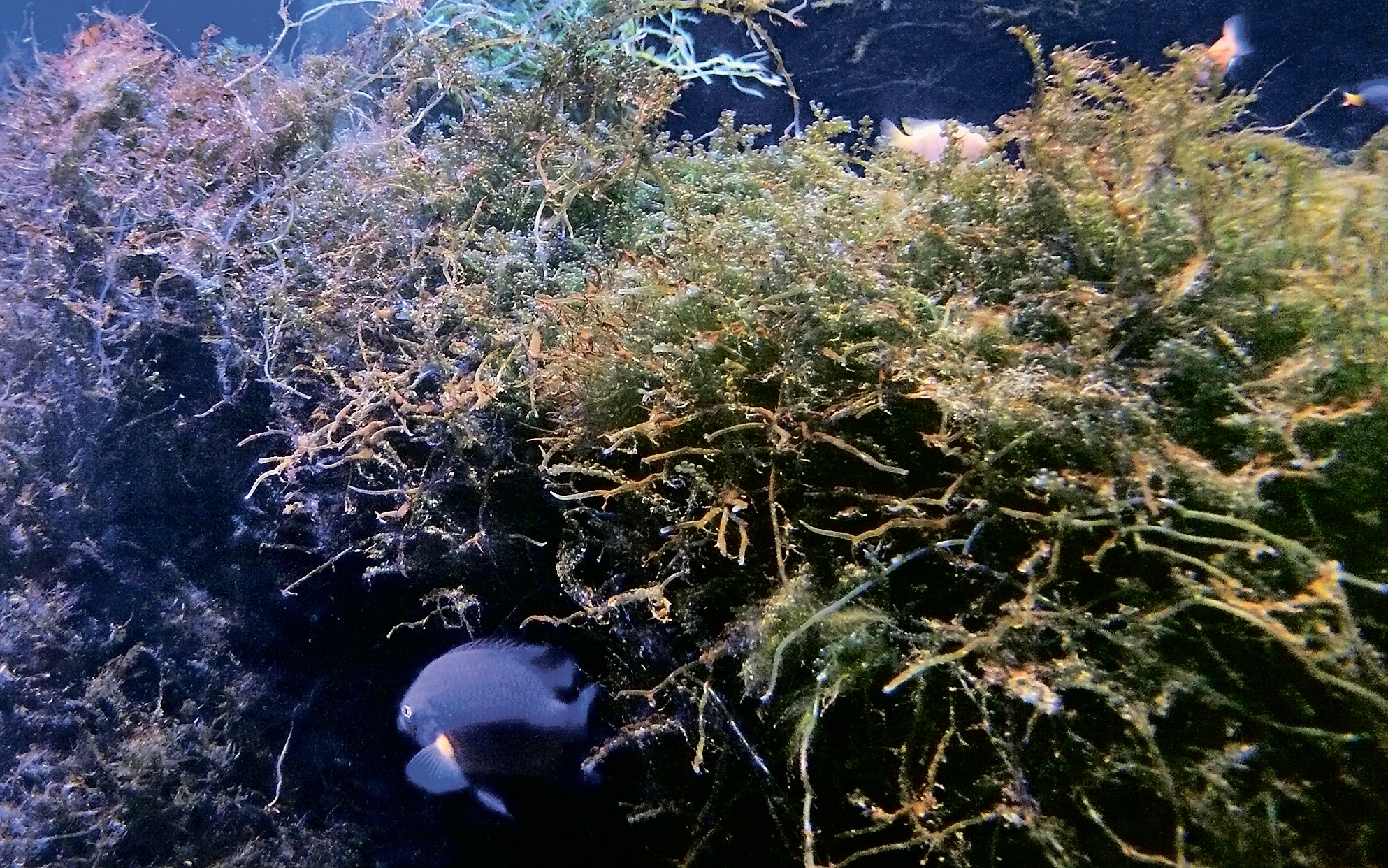 На морском мелководье, как и на суше, ведущая роль в производстве органики остаётся за растениями, но только сидящими на дне, — это водоросли и морские травы. Водоросли по своему устройству довольно примитивны, они не имеют цветов, плодов, корней, внутренних сосудов. Поэтому и поедающие их животные не так многообразны, как на суше, — им не было нужды приспосабливаться к питанию разными тканями и органами. Да и цветковые растения, переходя к водному бытию, сильно упрощаются. Донная растительность, как и наземная, нуждается в свете и потому не встречается там, куда не доходят солнечные лучи. На глубинах ниже двухсотметровой отметки жизнь базируется исключительно на льющемся сверху органическом «дожде».
