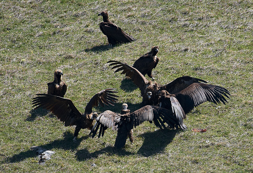 Однако вороны здесь — незваные гости, угощение, специально приготовленное и выложенное на дне котловины, предназначено не для них. Очередная подкормка (несколько десятков килограммов мясных фракций) была доставлена сюда накануне сотрудниками заповедника с целью учёта редких птиц Крыма — чёрных грифов и белоголовых сипов. И наблюдения за этими, не боюсь утверждать, удивительными созданиями.