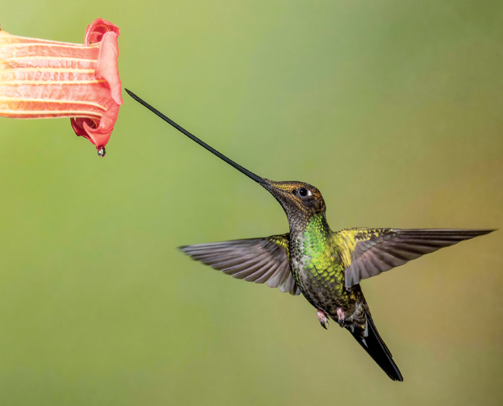 Единственная в мире птица, клюв которой длиннее её тела, — колибри-мечеклюв, житель Эквадора (см. фото). Средняя длина клюва 8—12 см, но бывают и особи с 15-сантиметровым клювом. Такая особенность почти не мешает летать, но сидеть на ветке приходится, только задрав голову вверх. Необычный признак выработался в эволюции для того, чтобы доставать нектар из цветков с очень длинным венчиком. Одной «заправки» птичке хватает на 10—12 минут. Это днём, а ночью колибри впадают в спячку и энергию почти не тратят.