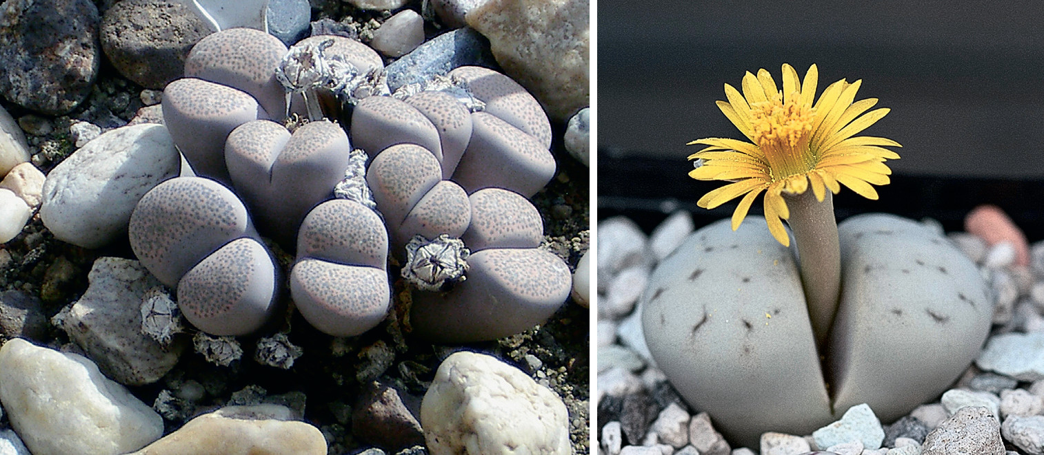 Южноафриканские растения рода Lithops называют живыми камнями: до цветения эти представители пустынной флоры выглядят почти как камни (фото внизу слева). Растение состоит из двух толстых округлых листьев, из щели между которыми появляется белый или жёлтый цветок (фото внизу справа).