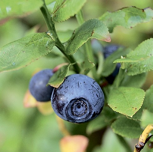 Плоды-ягоды у этого растения не велики, но благодаря чёрному цвету хорошо заметны. Иногда они покрыты сверху восковым налётом, который легко стирается. Мякоть внутри красновато-фиолетовая с многочисленными мелкими семенами. Ягоды охотно поедают лесные птицы: удоды, тетерева, глухари, рябчики, голуби вяхири. Они склёвывают чернику и затем разносят её семена по всему лесу, способствуя расселению этого растения.