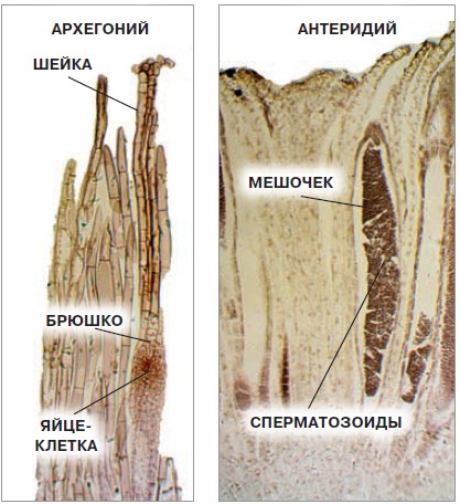 Со временем на заростке образуются женские и мужские половые органы папоротника. Женские называются архегонии, мужские — антеридии. Архегоний по форме похож на лабораторную колбу с длинной шейкой и брюшком, в котором находится яйцеклетка. Форма антеридия напоминает продолговатый мешочек на ножке, внутри которого обитают сперматозоиды.