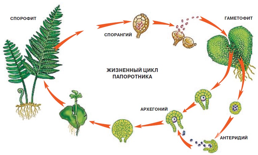 Как видим, у папоротника наблюдается бесконечный цикл смены двух очень разных поколений — спорофит сменяется гаметофитом и, наоборот, гаметофит — спорофитом. И в этом коренное отличие от позвоночных животных и человека.