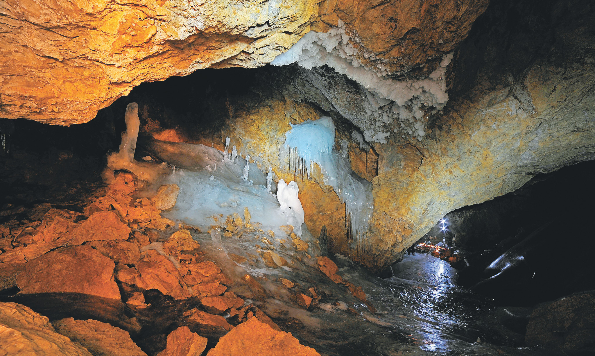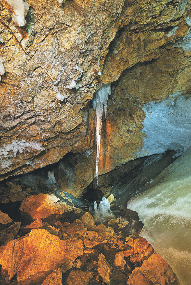От этого зала ответвляется небольшой грот, лишь частично заплывший льдом. В нём поверх рыжеватых глыб вырос роскошный «сад» ледяных сталагмитов.