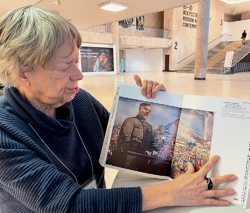 Ирина Анатольевна показывает в каталоге картину А. А. Моргунова «Ворошилов в Донбассе». Из подписи в каталоге: «ГМИ РК им. Савицкого… Предлагаемая датировка: начало 1930-х. Вероятно, картина выполнялась по заказу, но осталась в мастерской как неоконченная или отвергнутая выставкомом». Фото Наталии Данилевской