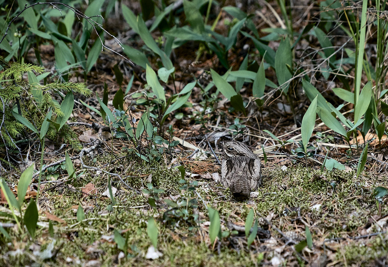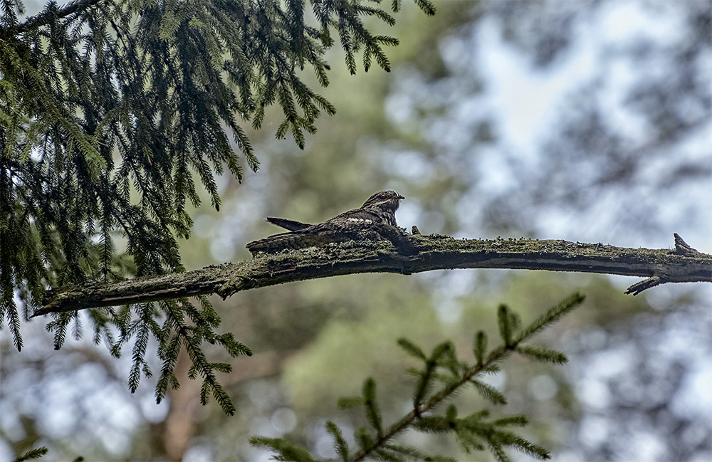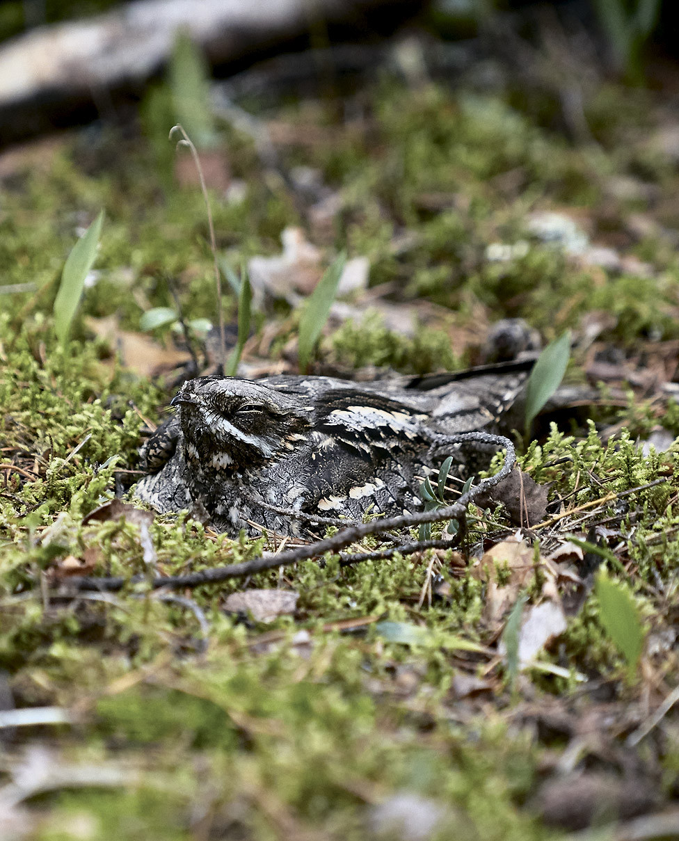 Предрассветные голоса дневных птиц разбудили меня вовремя. Ближайшей задачей стало найти самку, ведь токование козодоев-самцов всегда происходит в непосредственной близости от их гнёзд, порой в трёх-четырёх метрах. «Настроив» глаза на поиск знакомого образа, я стал методично, метр за метром, обходить подходящий биотоп козодоев. Вырубки, опушки, захламлённый лес и беломошники в сухом месте — среда их гнездования. Известно, что самого гнезда козодои не строят, а откладывают два яйца прямо на травянистый грунт. Но на практике оказывается, что козодои могут устроить гнездо даже на тропах грибников, отчего сами и страдают.
