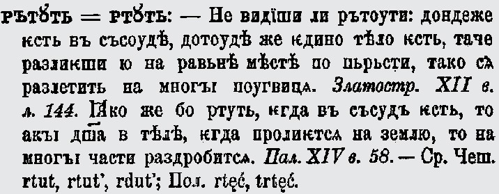 Срезневский упоминает церковно-славянский перевод проповедей Иоанна Златоуста*. Даже не разбираясь особо в своеобразном для современного читателя тексте, можно уловить основной смысл, который вкладывали наши предки в XII веке в слово «ртуть». Очевидно, что они, как и многие другие народы, для обозначения этого метала использовали слова, в первую очередь связанные с его свойством растекаться, разлетаться, разбрызгиваться на небольшие капли. Другими словами, одновременная подвижность, текучесть и схожесть с металлом находили отображение в названиях ртути во многих языках и в том числе в русском. Многочисленные подтверждения этому находим в словарях с участием всё того же Шанского**: