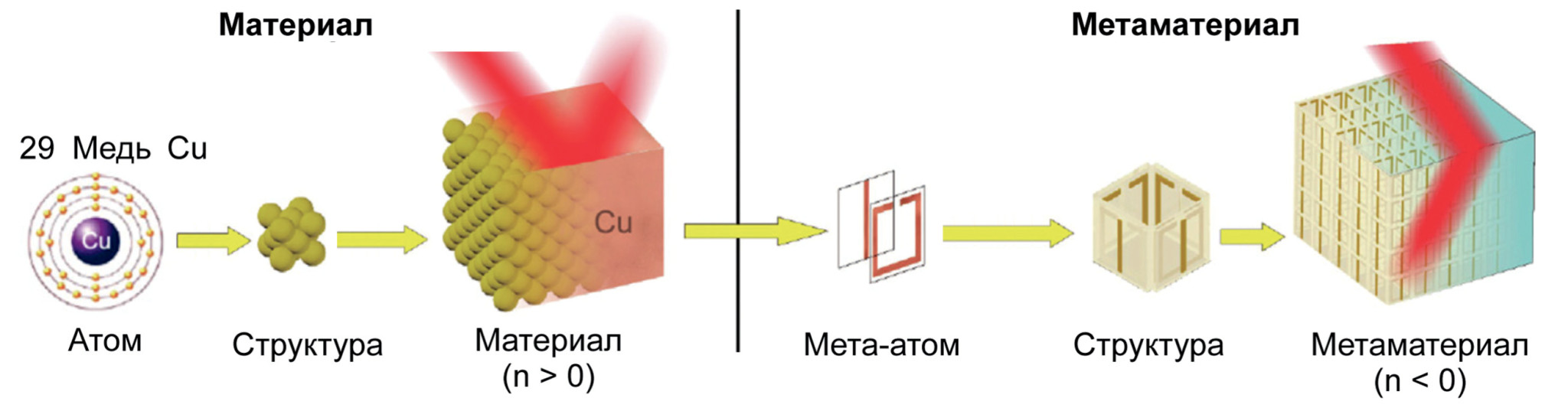 Каждый мета-атом состоит из одного или нескольких обычных веществ и поодиночке не создаёт никаких необычных свойств. Но стоит объединить мета-атомы в единую периодическую структуру, подобно тому, как из кирпичей возводят дома, и получаемый материал начинает проявлять свойства, выходящие за рамки привычных.