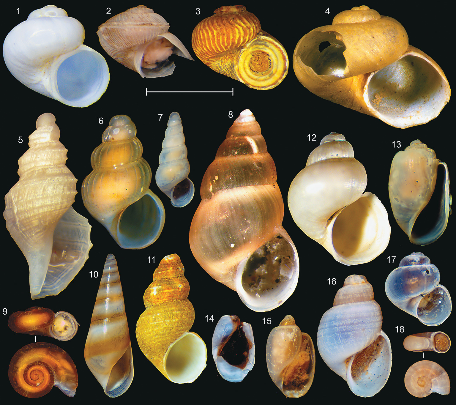 Микромоллюски Арктики весьма разнообразны. На фото можно видеть, как выглядят представители различных семейств: 1 — Skenea trochoides (Skeneidae); 2 — Anatoma crispata (Anatomidae); 3 — Moelleria costulata (Colonidae); 4 — Leptogyra bujnitzkii (Melanodrymiidae); 5 — Nepotilla amoena (Raphitomidae); 6 — Alvania verrilli (Rissoidae); 7 — Aclis sarsi (Aclididae); 8 — Peringia ulvae (Hydrobiidae); 9 — Skeneopsis planorbis (Skeneopsidae); 10 — Eulima bilineata (Eulimidae); 11 — Onoba improcera (Rissoidae); 12 — Elachisina globuloides (Elachisinidae); 13 — Retusa obtusa (Retusidae); 14 — Philine denticulata (Philinidae); 15 — Diaphana makarovi (Diaphanidae); 16 — Menestho truncatula (Pyramidellidae); 17 — Rissoella globularis (Rissoellidae); 18 — Omalogyra atomus (Omalogyridae).