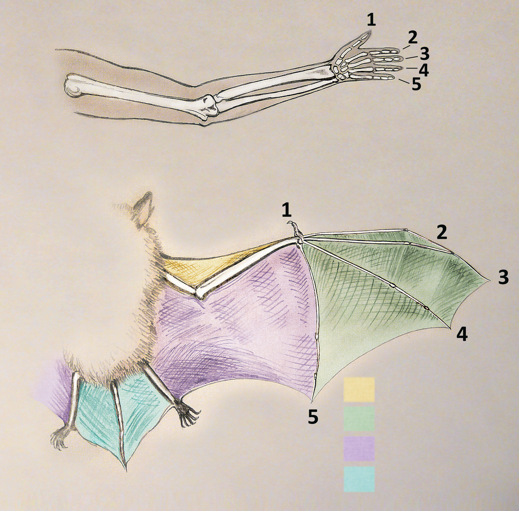 Крыло летучей мыши — это её передняя конечность, как наша рука. Но если птицы в полёте «опираются» на перья, то рукокрылые — на кожистую перепонку, натянутую между пальцами. Фаланги пальцев и пястные кости (длинные кости ладони) удлинились у них настолько, что некоторые по длине сравнялись с предплечьем. Коротким остался только первый палец, и на нём сохранился коготок. Именно этот коготок помогает зверькам ловко лазать по стенам и потолку, цепляясь как задними лапками, так и сгибом крыла. Тонкая, упругая кожа натянута не только между пальцами. От мизинца она тянется к задней лапе, а между ногами и хвостом обычно есть перепонка. Замедленные съёмки показывают, что для полёта и охоты важны все части крыла. Например, многие насекомоядные летучие мыши в полёте захватывают добычу именно хвостовой перепонкой.