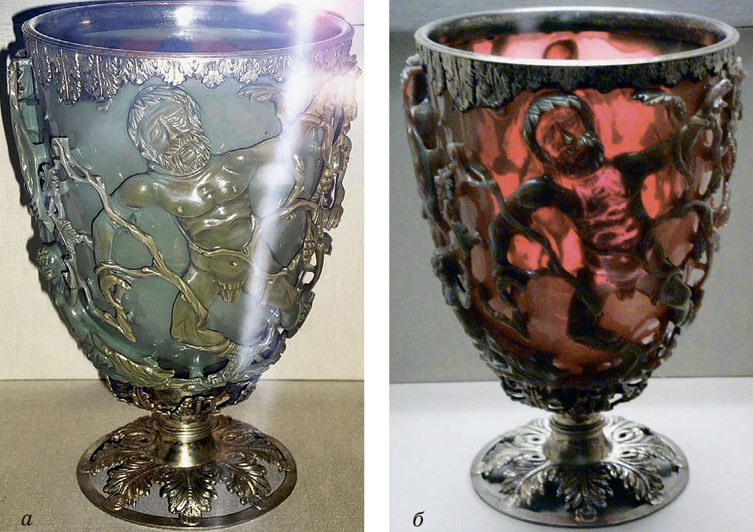 Кубок Ликурга. Фото со вспышкой (а) и при обычном освещении (б). Изменение цвета в зависимости от освещения (угла падения света) связано с наличием в стекле мельчайших частиц коллоидного золота и серебра. Фото: Brit_Mus_13sept10_brooches_etc_044.jpg: Johnbod/Wikimedia Commons/ CC BY-SA 3.0.