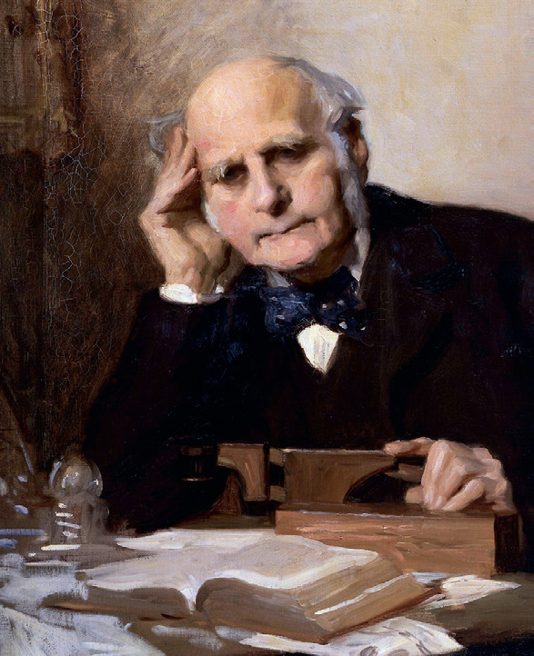 Сэр Фрэнсис Гальтон (1822—1911), англий-ский географ, антрополог, психолог, статистик, основатель дифференциальной психологии и психометрики, создатель учения евгеники; двоюродный брат Чарльза Дарвина; получил незаконченное высшее образование; много путешествовал с экспедициями по Ближнему Востоку и Южной Африке; занимался вопросом наследования биологических признаков у человека и животных; создал первую в мире антропометрическую лабораторию; заложил основы дерматоглифики и дактилоскопии; в 1907 году учредил Общество евгенического образования. Портрет кисти Чарльза Фарса. 1903 год. Национальная портретная галерея, Лондон (Великобритания).