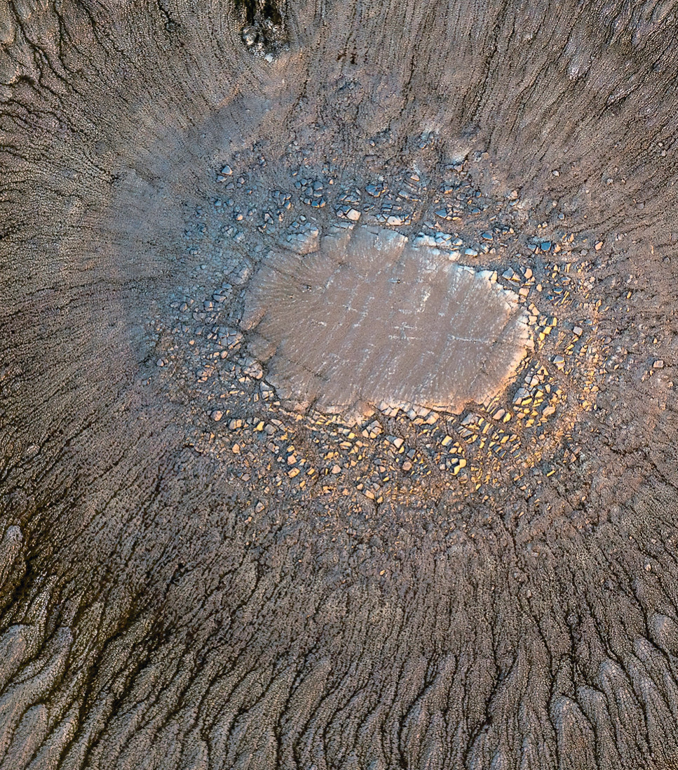 Первым делом мы посетили объект, который был ближе и доступнее всего. Он представлял собой почти плоскую гору куполообразной формы. Периодически, на пути к слабо выраженной вершине, приходилось пересекать довольно широкие каменистые гряды, состоявшие из обломков осадочных пород. Они тянулись в обе стороны, явно образуя концентрические окружности вокруг купола, но масштаб горы не позволял представить себе гигантский узор, сложенный этими образованиями. Зато когда мы достигли вершины купола и в воздух взвились взятые с собой квадрокоптеры, первые же фотографии с высоты заставили ахнуть от восхищения. Мы находились прямо в центре зрачка гигантского глаза! Узкие и тёмные радиальные линии (высохшие водотоки) лишь добавляли сходства с роговицей.