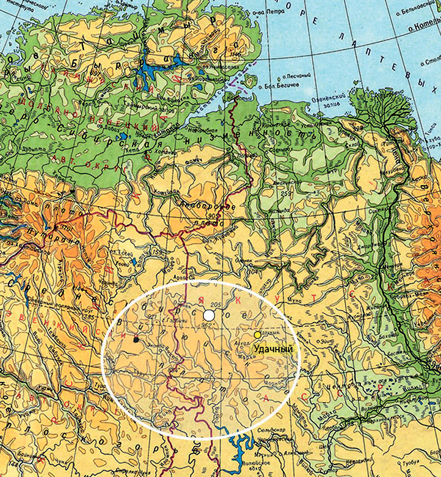 С северо-западной окраины «Глаза» мы увидели вдалеке проблески воды — там, за зелёной полосой тайги, змеился Оленёк. Именно здесь в 1853—1855 годах прошла экспедиция под руководством Ричарда Карловича Маака. Исследователи пересекли тогда Вилюйское плато дважды, пройдя вначале на север от Вилюя до реки Оленёк, а потом, переместившись восточнее до правого её притока Алакита в месте впадения в него реки Мастах, повернули обратно на юго-запад к Вилюю. Интересно, что Р. К. Маак ошибочно принял пересечённый им водораздел за широтный хребет, тянущийся на восток до реки Лена: «Хребет, служащий с одной стороны, именно с южной, водоразделом притоков реки Вилюя, с северной и северо-западной — речных систем Оленёка и Хатанги, до настоящего времени не имеет научного названия, и я предлагаю назвать его Вилюйским хребтом»2.