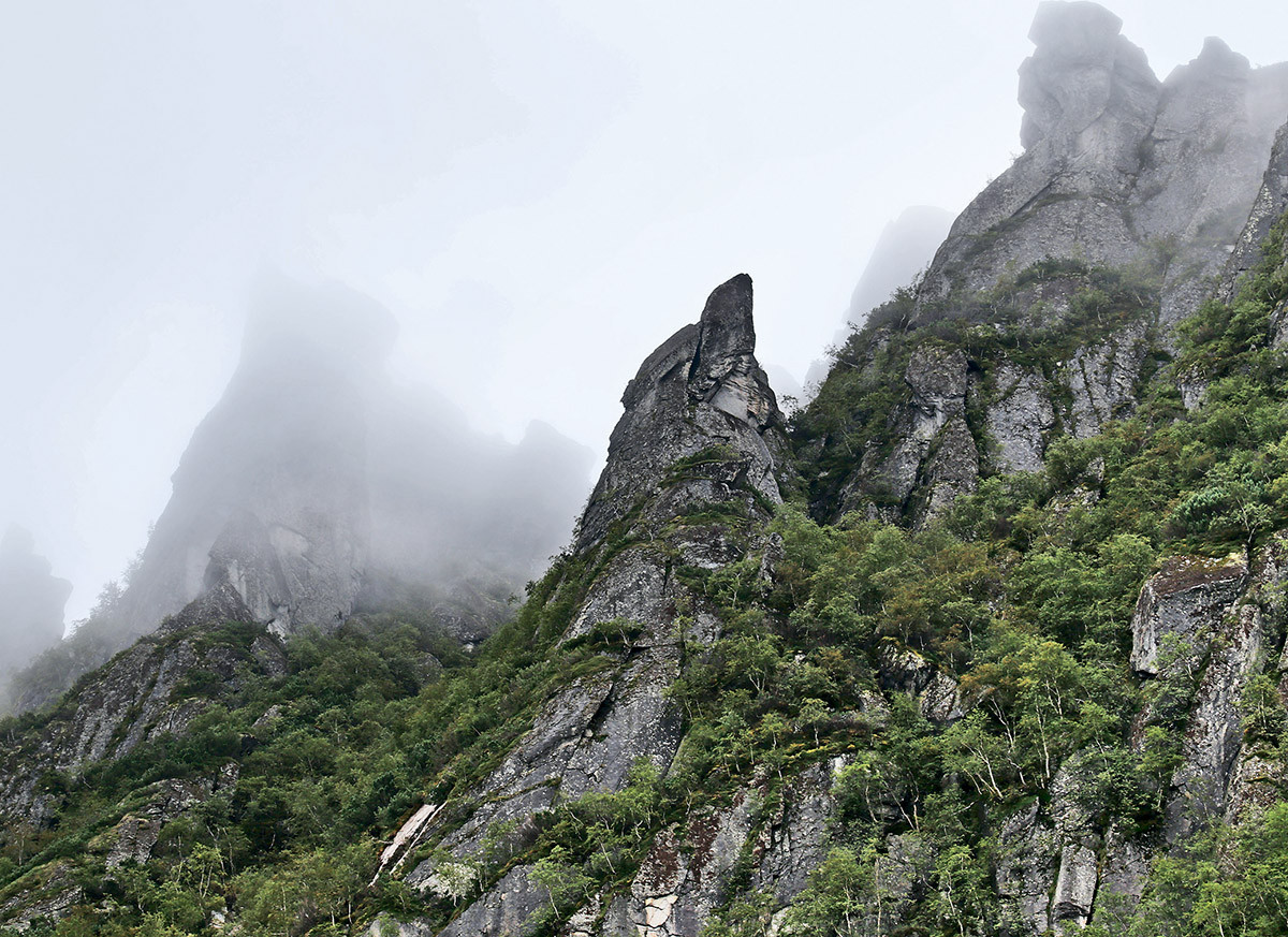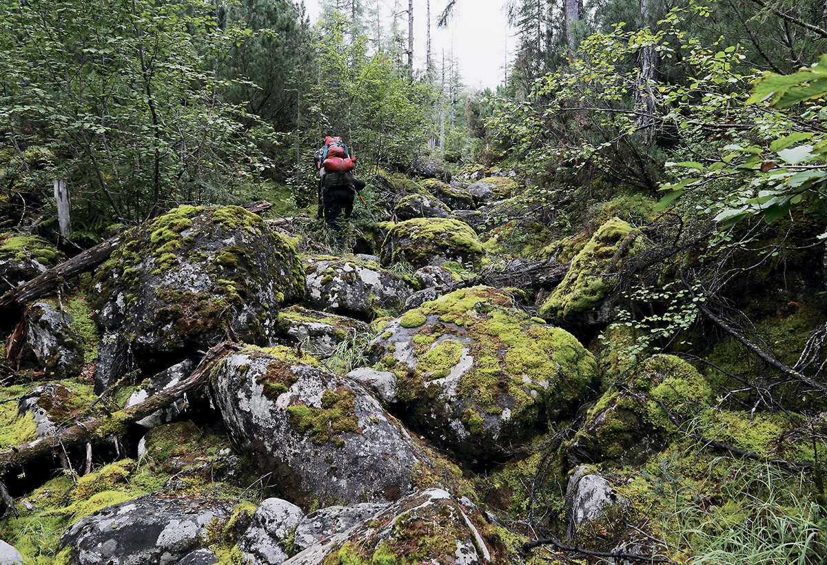 Дорога пролегает по отвалам грунта, промытого некогда золотодобывающей драгой. То и дело ныряет в речки и канавы. Нависшие деревья нещадно стегают по стеклу. Три часа вверх-вниз по сопкам. Старенький «Урал» кряхтит, но едет уверенно. До цели оставался всего километр, когда неожиданно машина по оси погрузилась в разжиженную дождями болотину… Общими усилиями ближе к вечеру её всё же удалось вызволить. Отправив счастливого водителя обратно домой, взваливаем тяжёлые рюкзаки на плечи и двигаемся дальше.