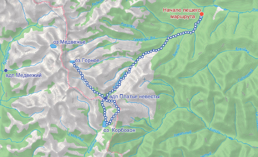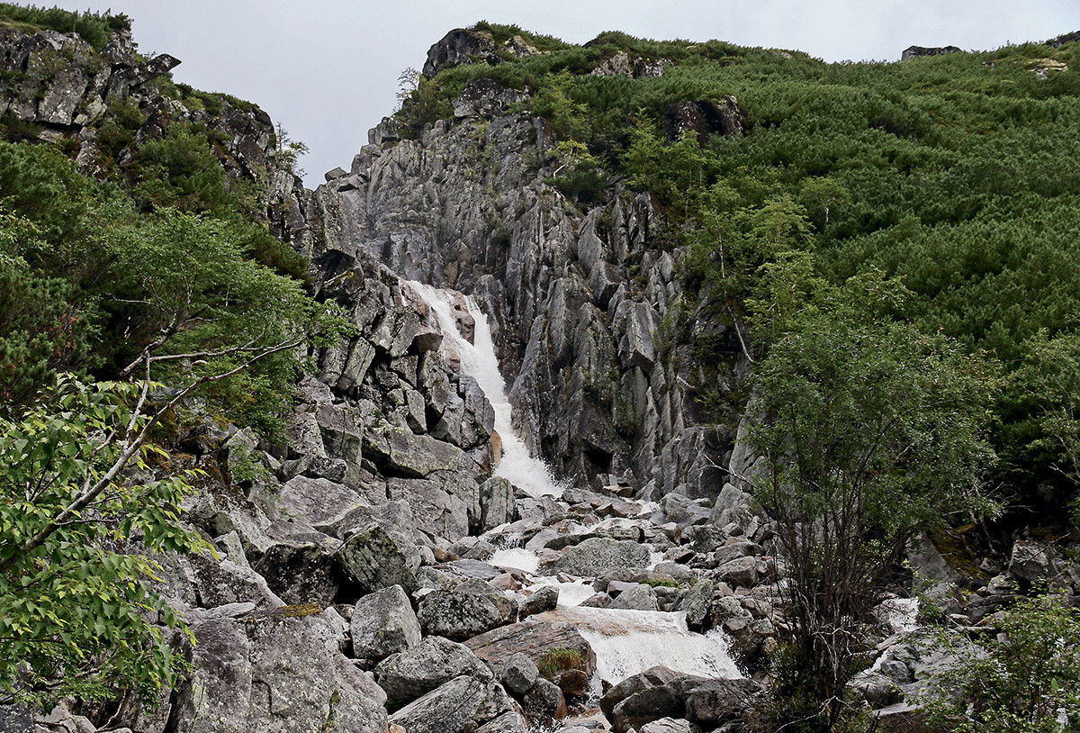 По плану мы должны были идти три дня берегом ручья Водопадного до каскадного водопада, известного под неофициальным названием «Платье невесты», где предстояло разбить базовый лагерь на краю горного плато. До точки назначения всего-то 17 км. Вначале нам показалось, что предстоит лёгкая прогулка. Но мы даже близко не представляли себе, что это будут за километры!