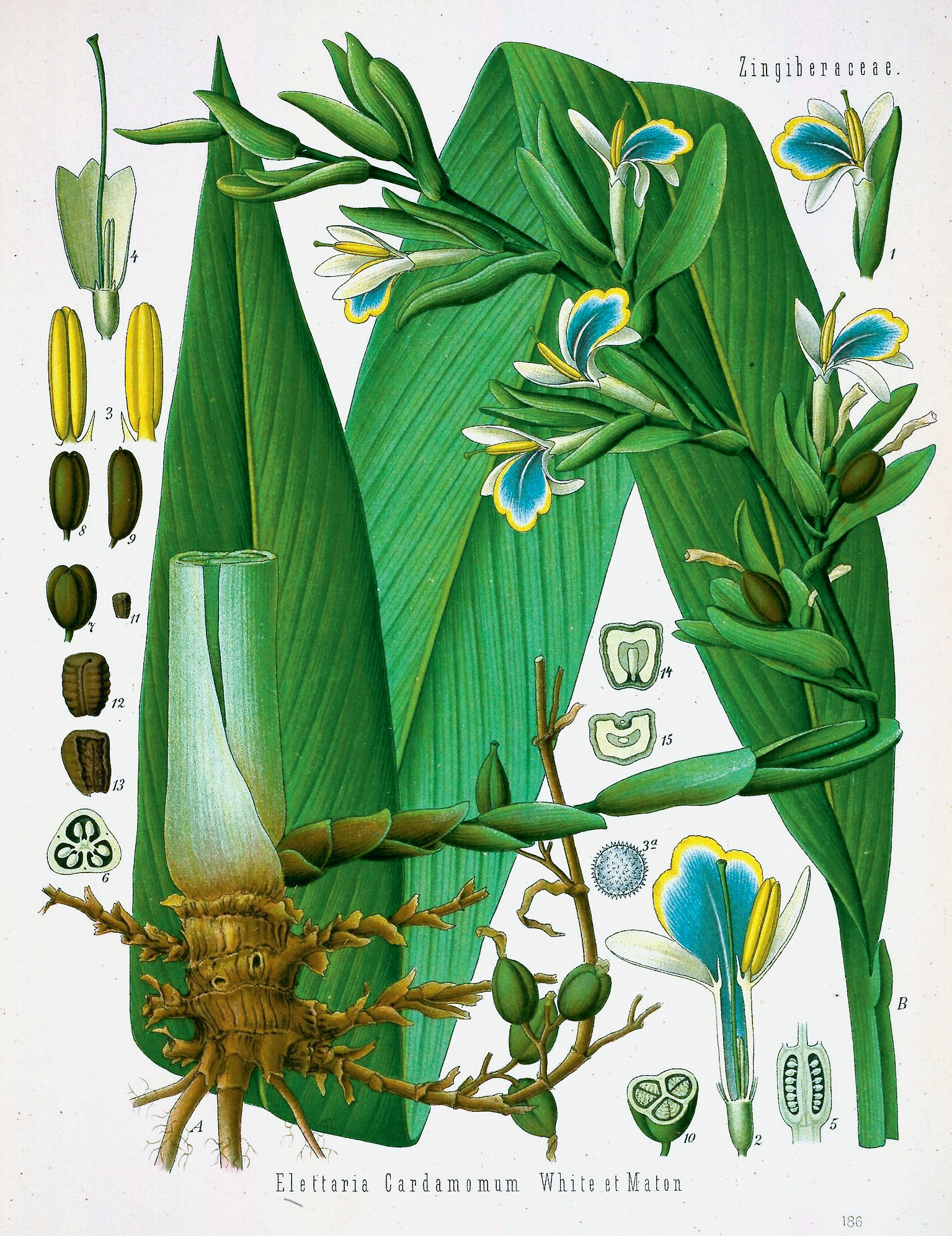 Кулинары всего мира для ароматизации своих съедобных шедевров предпочитают использовать кардамон настоящий, или элаттрию кардамоновидную (Elettaria cardamomum). Это тропическое многолетнее травянистое растение внешне напоминает тростник высотой до 4 метров. Листья бледно-зелёные, продолговатые, копьевидные, шелковистые на ощупь. Красивые желтовато-бело-голубые цветки собраны в длинную кисть. Плоды кардамона — трёхкамерные коробочки с кожистой зелёной кожурой, в которых может находиться до двадцати овальных ароматных, со жгучим вкусом, семян красно-коричневого цвета. Родина кардамона настоящего — Малабарский берег, историческая область на юго-западе полуострова Индостан, длинное и узкое побережье Индийского океана. В 1471 году здесь побывал тверской купец Афанасий Никитин, имея целью познакомиться с рынком товаров, в том числе и пряностей. Он сошёл с корабля в порту Чаул за четверть века до прибытия в те места Васко да Гамы, португальского первооткрывателя морского пути из Европы в Индостан…