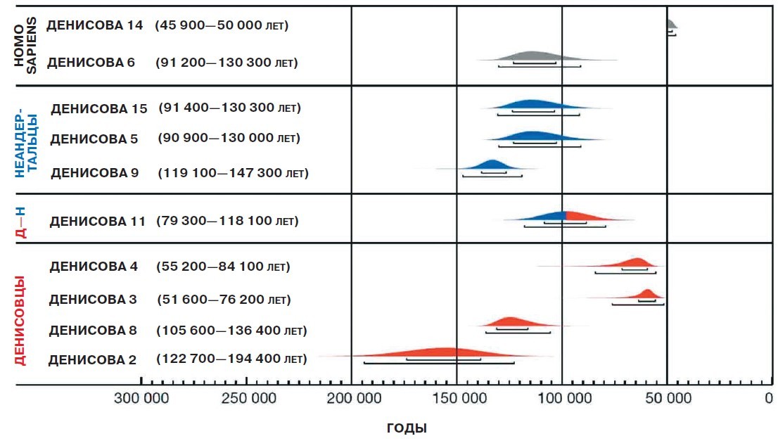 В другой статье сотрудники Института наук об истории человека Общества Макса Планка (Max Planck Institute for the Science of Human History, Германия), Института эволюционной антропологии Общества Макса Планка (Max Planck Institute for Evolutionary Anthropology, Германия), Университета Оксфорда (University of Oxford, Великобритания), Института археологии и этнографии СО РАН и др. (всего 21 автор из 10 научных центров) представили 50 новых радиоуглеродных датировок слоёв Денисовой пещеры (от конца среднего до верхнего палеолита). Они также проанализировали с помощью метода масс-спектрометрии найденные в слоях пещеры 2,2 тысячи мелких фрагментов костей. Среди них им удалось найти три костных фрагмента рода Homo, чей возраст они определили радиоуглеродным методом, а из образца Denisova 15 выделили митохондриальную ДНК (она оказалась неандертальской). Кроме того, исследователи пересчитали возраст остальных образцов древних людей из Денисовой пещеры генетическим методом. Они определили относительный генетический возраст четырёх денисовцев и двух неандертальцев. (Чтобы определить относительный генетический возраст, сравнивают митохондриальную ДНК данных образцов с митохондриальной ДНК неандертальцев известного возраста.)