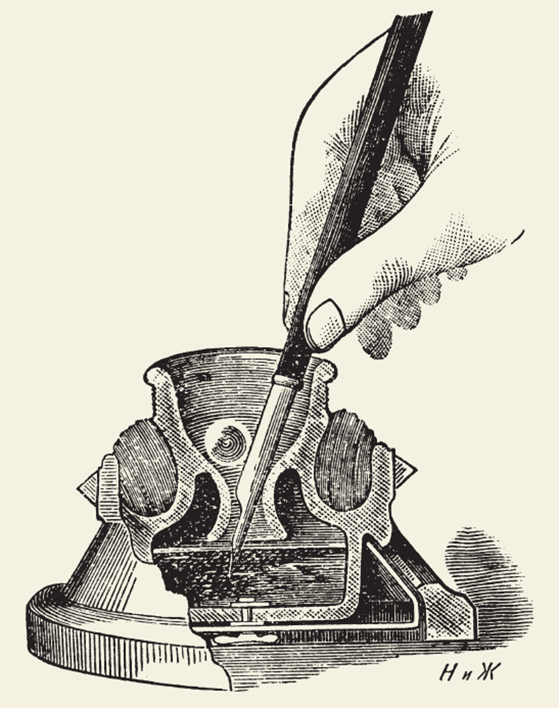Этих неудобств нельзя избежать даже при полной аккуратности. В самом деле, нельзя же закрывать чернильницы после каждого обмакивания пера и открывать, когда надо обмакнуть. Во все время писания чернильница остается открытой, а многие занимаются по несколько часов. Наконец, далеко не многие отличаются такой аккуратностью, чтобы, окончив писать, не позабыть закрыть чернильницу. Между тем иметь хороший письменный прибор весьма важно. Вам приходит в голову, во время писания, остроумная
