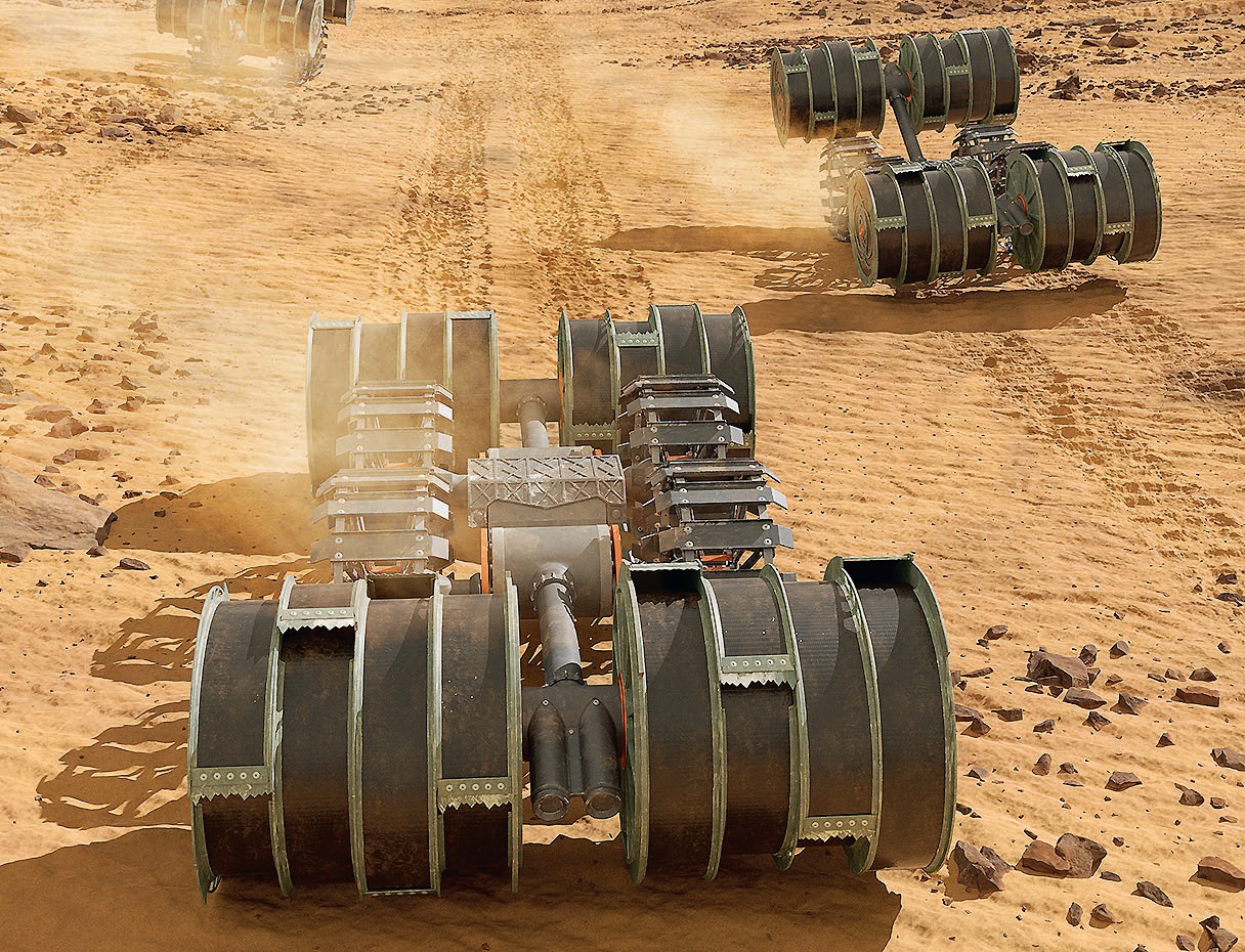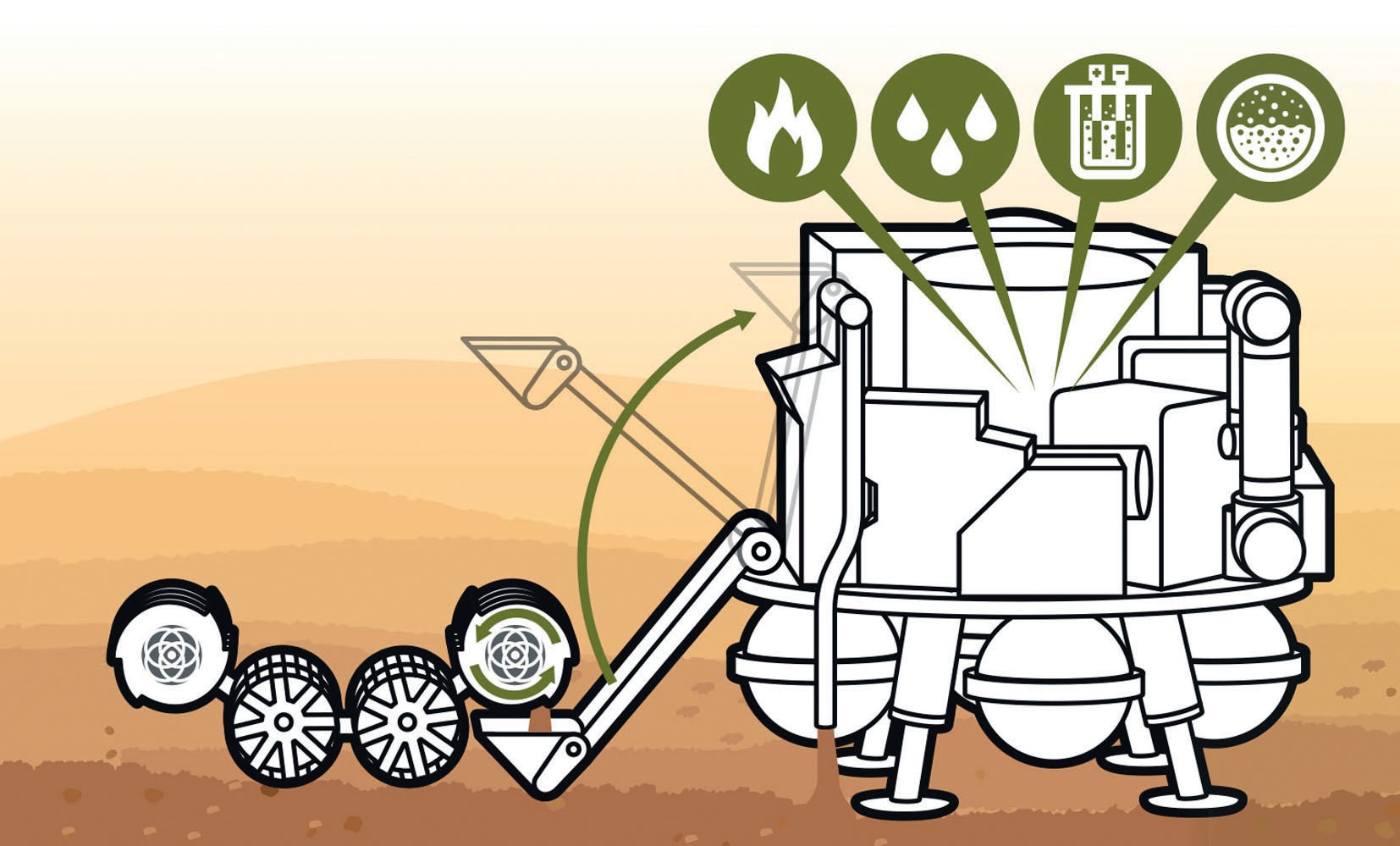 Поверхность Марса покрыта слоем реголита — вулканических пород, со временем превратившихся в тонкий порошок. Под слоем окисленных железосодержащих минералов, придающих поверхности планеты красноватый оттенок, лежит более толстый слой силикатных пород — оливина, пироксена и полевого шпата, состоящих из соединений кремния, кислорода, железа, алюминия и магния. Как добывать эти минералы, чтобы получить из них нужные соединения? Экскаватор не годится, доставить его на Марс было бы слишком сложно и дорого. Поэтому инженеры НАСА построили небольшой автономный агрегат, способный копать реголит, используя для этого два ковшовых ротора. Они вращаются в противоположных направлениях, захватывая рыхлый грунт. По задумке разработчиков, такая машина, заполнив свои роторы, будет подъезжать к перерабатывающему модулю и разгружать накопанный материал. Здесь реголит нагреется, при этом выделится содержащаяся в нём вода. В некоторых районах Марса её очень мало, в других — до 8% от веса грунта, в третьих — на глубине 1 м или чуть глубже лежат слои льда. То, что осталось после выделения воды, можно применять как строительный материал для создания марсианской научной станции, дорог и посадочных площадок.
