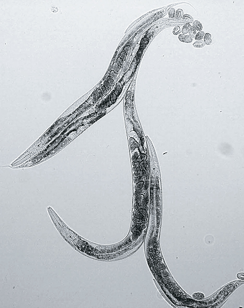 Ещё более простой и удобный в работе объект у Хироцу Такааки из университета Кюсю. Это популярная в биомедицинских исследованиях нематода Caenorhabditis elegans, которую несложно разводить в лаборатории и можно вообще не кормить месяцами. В 2015 году Такааки обнаружил, что эти микроскопические (длиной около миллиметра) червячки, помещённые рядом с каплей человеческой мочи, отползают в сторону, если человек здоров, но привлекаются к капле от больного раком. На следующий год открыватель основал фирму, имеющую сейчас в Японии три центра диагностики. Робот-манипулятор капает исследуемый образец на край чашки Петри, а в середину высаживает массу нематод. Если они ползут к каплям, значит, почуяли один из 15 типов злокачественного процесса. Анализ для верности повторяют несколько десятков раз. Но более точный диагноз — какого конкретно органа процесс коснулся — червячки не дадут. Сейчас сотрудники фирмы намерены, применяя методы генной инженерии, обострить обоняние червей. В 2022 году руководители компании надеются разработать тест, специфичный для рака поджелудочной железы.