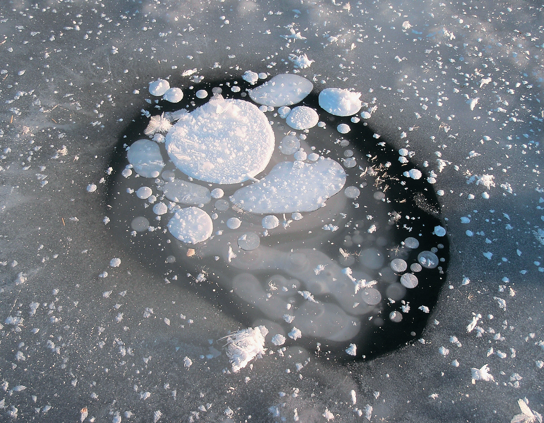 Чтобы понять, где находится «метановая бомба» и что может привести её в действие, присмотримся повнимательнее к свойствам метана и ещё одного простого вещества — воды. При обычных условиях вода — это всем известная жидкость, а метан — газ. Можно очень-очень небольшое количество метана растворить в воде или, к примеру, заморозить пузырьки газа во льду. Без какого-то особого воздействия эти два вещества совсем «не горят желанием» ни вступать в реакции друг с другом, ни даже просто физически смешиваться. Но всё меняется, если они окажутся под относительно высоким давлением (примерно в 30 раз больше атмосферного) и при температуре близкой к 0оС. Несмотря на то, что по отдельности при таких условиях метан остаётся газом, а вода жидкостью, вместе они образуют твёрдую массу, чем-то похожую на плотный снег или рыхлый лёд. Называется такое не совсем обычное химическое соединение «гидрат метана».