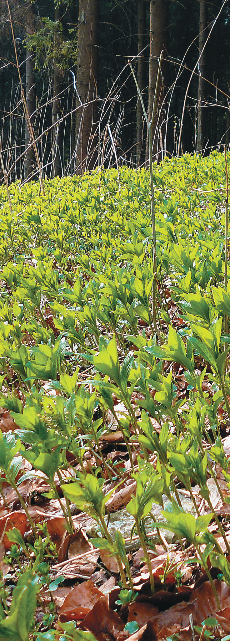 К таким насыщенным зелёной краской первоцветам относится пролесник многолетний (Mercurialis perennis) из семейства Молочайные (Euphorbiaceae). Произрастает он почти по всей Европе, кроме севера таёжной зоны, в смешанных и лиственных лесах. Появляется из земли очень рано, после схода снега, и сразу с бутонами. Предпочитает сырые места и рыхлую, богатую питательными веществами почву. Особенно хорошо себя чувствует там, где в весеннее время активного роста и цветения будет получать достаточно света.