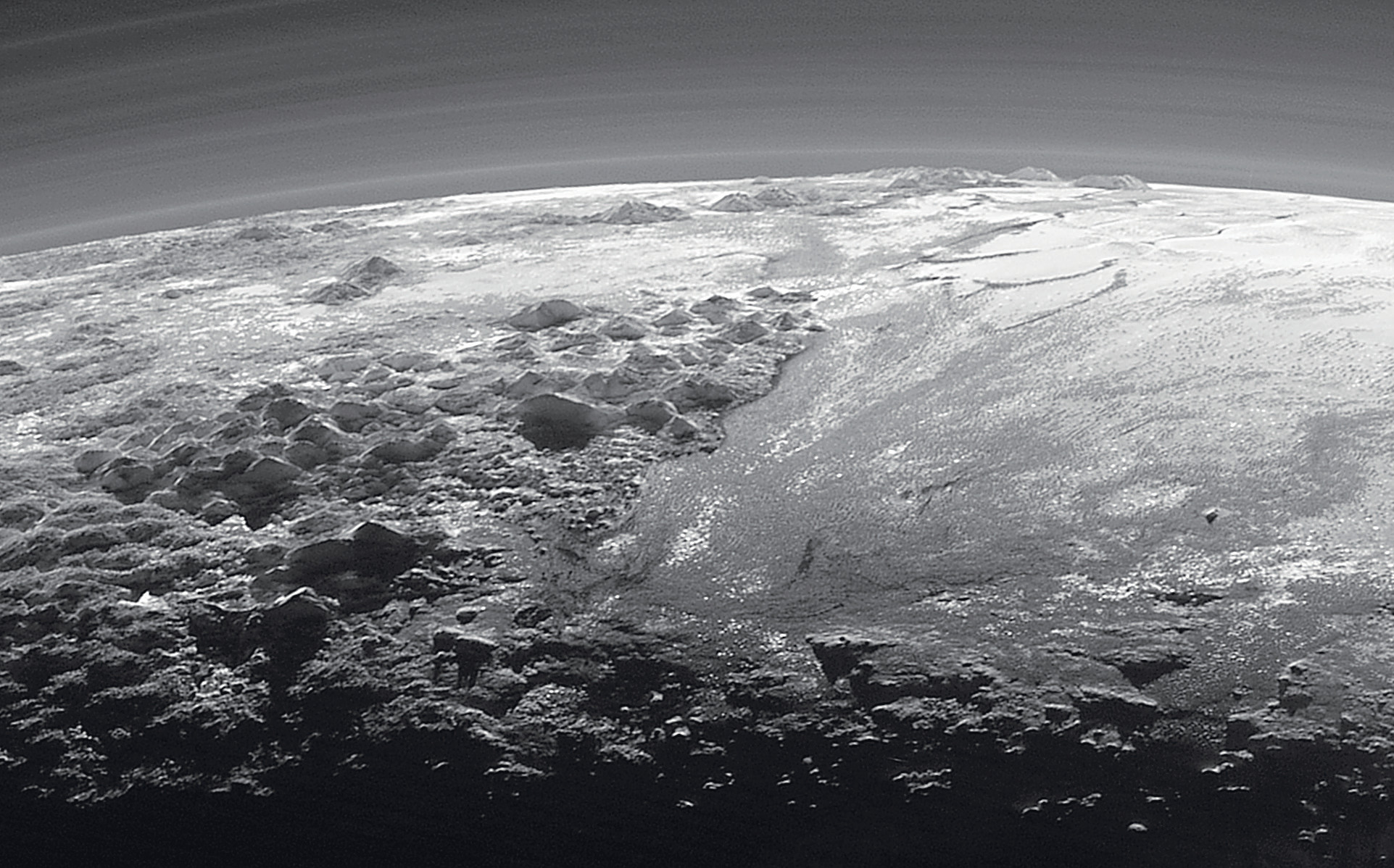 Взгляд цепляется за горы высотой немногим больше 3 км. Гладкие склоны говорят об их молодости и, соответственно, о присутствии тектонической активности. Это горы Тенцинга. Мощная гряда обрамляет край равнины Спутника. У подножья — настоящий каток, кажущийся с высоты ровным и гладким. Память о Земле рисует в воображении картинку, напоминающую океан, по берегам которого возвышаются горы. Но в отличие от Земли, где и в штиль на водной глади наблюдается некоторое волнение, на Плутоне кажется, будто холод остановил даже время — всё выглядит неподвижным и застывшим в сумрачном безмолвии. Однако это лишь иллюзия — движение есть, но оно крайне медленное.