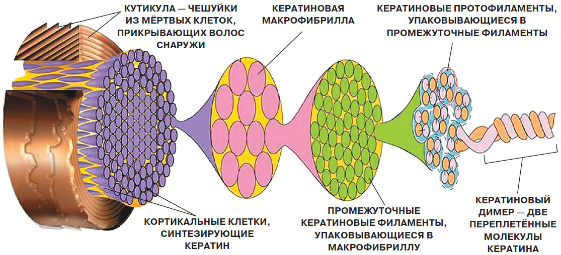 Посмотрим на то, как устроен человеческий волос на молекулярном уровне. По большей части волосы состоят из вытянутых, спиралеобразных молекул белка кератина. Белковые молекулы соединяются в пучки, обвиваются вокруг друг друга и перекрывают друг друга так, чтобы конец одной молекулы соединялся с началом другой. Вместе их удерживает множество связей различной природы.
