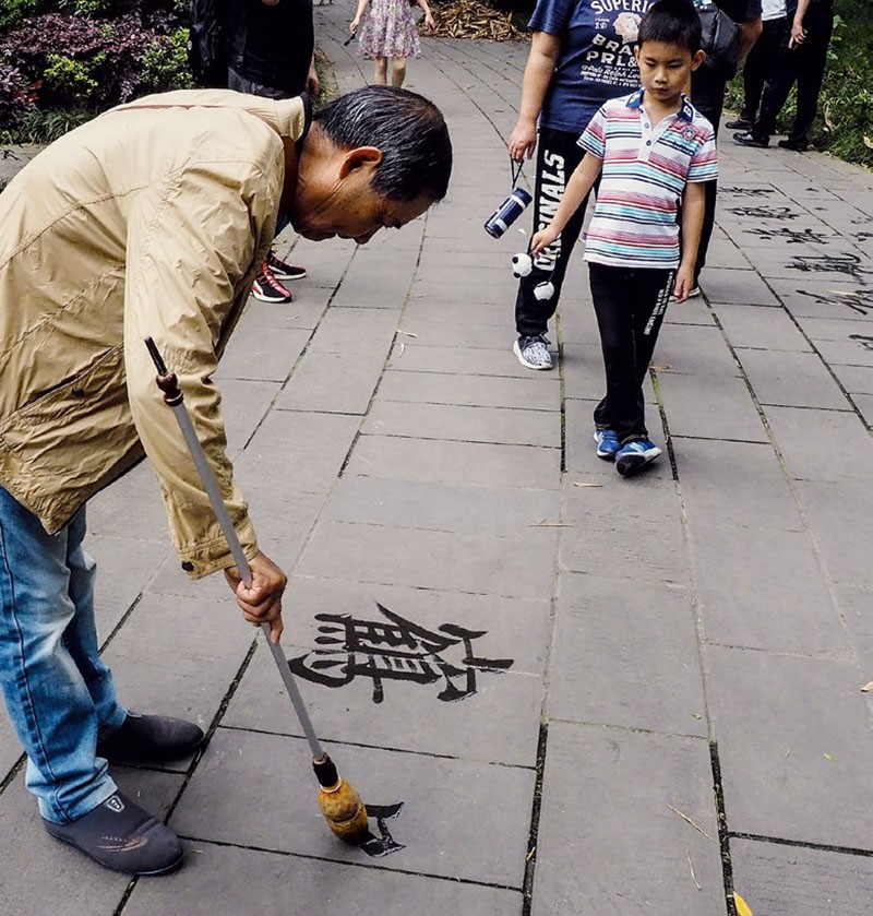 Однако в бамбуковом парке города Чэнду я остановилась, как и многие другие прохожие: окуная большую кисть в ведёрко с водой, пожилой мужчина писал ею на асфальте изысканные иероглифы.