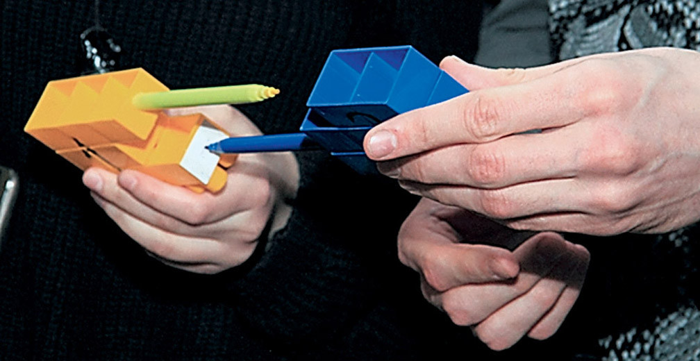 Нетранзитивные гребёнки. Кончик фломастера напоминает клин. Разовьём идею применения клиньев. Можно ли использовать клин как наклонную плоскость для таких нетранзитивных механизмов, при взаимодействии которых один поднимает другой? Возможный вариант показан на рисунке.