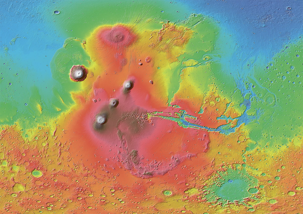 Любопытно, что высочайшие горы Марса не разбросаны по всей планете, а сосредоточены в одной локации. Провинция Фарсида — это регион, представляющий собой огромное вулканическое нагорье в экваториальной области площадью 30 млн км2, что сопоставимо с площадью Африки. Вулканы расположены недалеко от Долины Маринер и Лабиринта Ночи на плато, частично окружённом впадиной. Даже без их учёта разница высот между плато и впадиной составляет 10 км.
