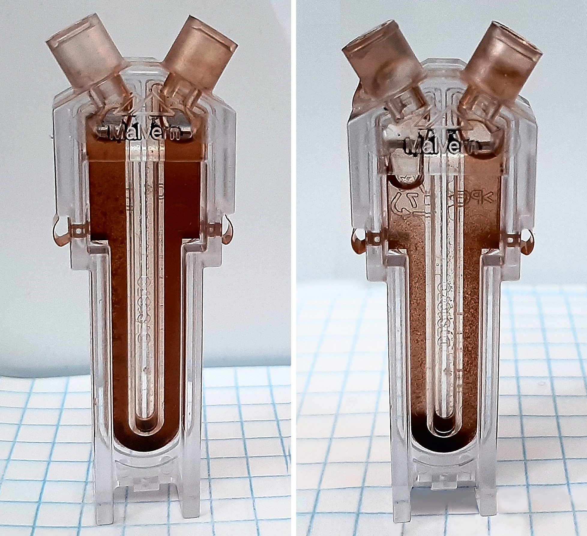 — Стабильность — первое, на что лично мы с коллегами обращаем внимание. В отличие от многих других характеристик, её легко оценить визуально, прежде чем исследовать полученный раствор с привлечением каких-то сложных физических методов, реализуемых на дорогом научном оборудовании. Часто в статьях даже в рецензируемых научных журналах можно встретить заявления о «крайне стабильных золях», за которыми следуют фотографии этих «крайне стабильных золей», выпадающих в осадок. В моём понимании, золь себя так вести не должен. В русском языке, увы, есть только слово «мутный», а в английском в этом плане разнообразия больше — и «turbid», и «cloudy», и «opaque». Так вот, разбавленный стабильный золь маггемита, например, похож на чёрный чай без каких-либо признаков мутности. Эти визуальные признаки тесно связаны с понятием микрогетерогенности, которое подразумевает, что на большом масштабе золь выглядит как раствор без признаков расслоения или выпадения осадка, но на масштабах десятков—сотен нанометров состоит из отдельных частиц твёрдого вещества, распределённых в жидкости-носителе.
