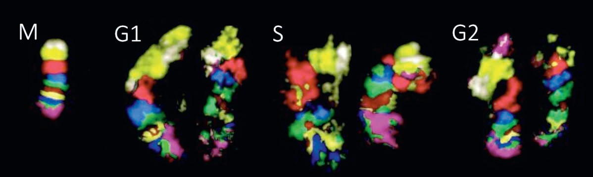 Какие тут закономерности? Во-первых, когда хромосомы после деления из конденсированной, плотно упакованной палочки превращаются в расплывчатый клубок (деконденсируются), они не перемешиваются друг с другом и не распределяются равномерно по всему ядру. Методами микроскопии и методом Hi-C удалось показать, что хромосомы занимают ограниченные и к тому же неперекрывающиеся области, получившие название «хромосомные территории». То есть хромосомы не перемешиваются друг с другом и внутрихромосомные контакты намного более вероятны, чем межхромосомные. Даже гомологичные хромосомы — то есть те, которые несут одинаковые гены, но достались от разных родителей, — в человеческих клетках занимают разные участки, которые могут и не соседствовать. И если внутрихромосомные контакты обычно воспроизводятся после деления, то межхромосомные — как правило, нет, так как хромосомные территории распределяются в каждом клеточном цикле случайным образом.