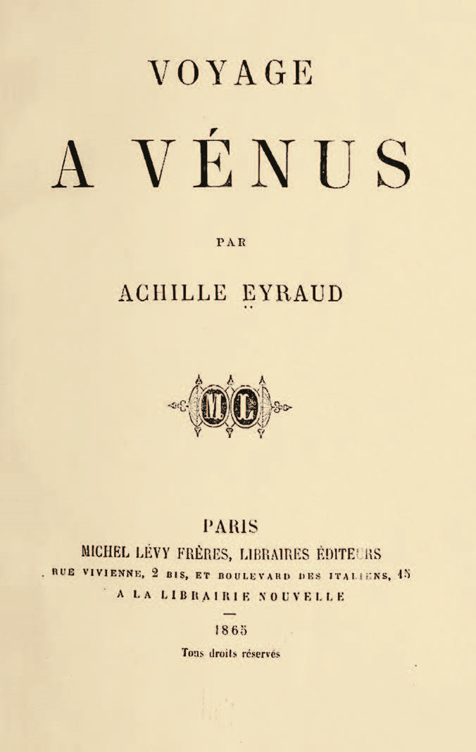 В 1865 году парижское издательство «Мишель Леви и братья» (Michel Lévy Frères) выпустило роман французского юриста, писателя, драматурга и поэта Ахилла Эро (Achille Eyraud) «Путешествие на Венеру» (Voyage à Vénus). Несмотря на хвалебную рецензию прославленного Эмиля Золя, произведение Эро не вызвало большого интереса у публики на фоне появления нового романа Жюля Верна «С Земли на Луну прямым путём за 97 часов 20 минут» (De la Terre à la Lune, trajet direct en 97 heures 20 minutes).