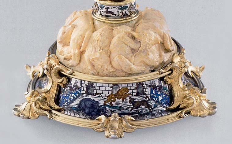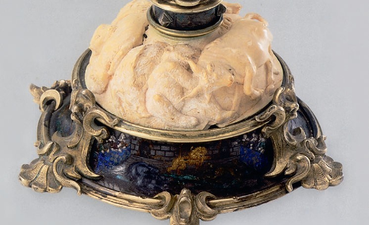 Мастер использовал три драгоценных материала: золочёное серебро, слоновую кость и полихромные эмали.