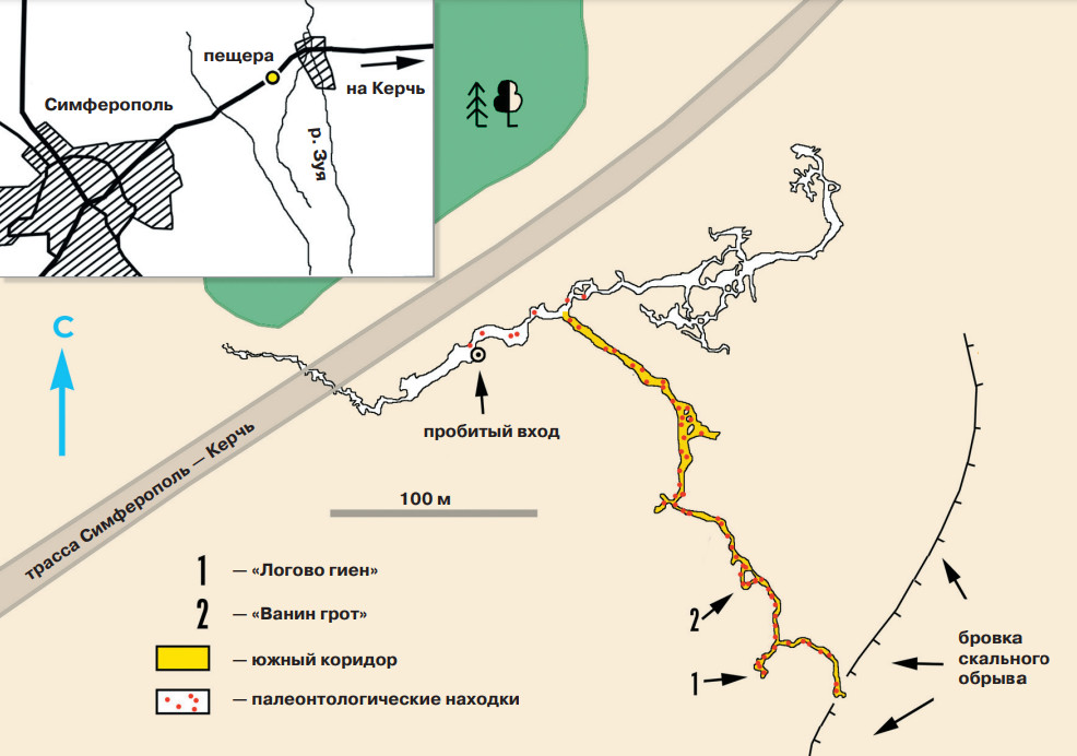 Вызванные из Крымского федерального университета им. В. И. Вернадского спелеологи Геннадий Самохин и Дмитрий Старцев обнаружили множество костей ископаемых позвоночных. Палеонтологический институт РАН и Институт экологии растений и животных УрО РАН срочно направили своих специалистов, то есть нас — Александра Лаврова и Дмитрия Гимранова. При помощи команды спелеологов из Симферополя мы в том же 2018 году собрали здесь (в точке, названной «Логовом гиен») остатки различных млекопитающих и птиц, которые обитали в промежутке от 1,5 до 1,8 млн лет назад. Этот геологический интервал называется ранним плейстоценом. Тогда начался великий климатический перелом и жаркий климат Земли сменился условиями ледникового периода. Фауна этого времени называется в России псекупской, а в Западной Европе — поздневиллафранкской. Тогда на Земле жили ныне вымершие гигантские ископаемые виды животных: от слонов и носорогов до верблюдов, гиен и страусов. И, кроме того, на планете обитали свирепые хищники — саблезубые тигры.