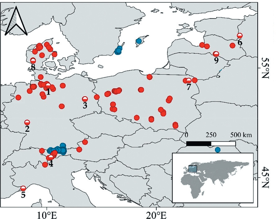 Карта распространения Bryodemella tuberculata (вымерших и существующих), основанная на данных, собранных из литературы, музейных документов и частных коллекций. Цифры с 1 по 9 показывают местонахождения, где B. tuberculata в настоящее время считается вымершим видом по самым последним данным. Синими кружками обозначены существующие ареалы обитания Bryodemella tuberculata. Красными кружками обозначены места, где ширококрылая трещотка вымерла, красно-белыми — самые последние данные об ареалах, где вид вымер. Рисунок (с изменениями) из статьи: Dey L.-S., Simões M. V. P., Hawlitschek O. et al. Analysis of geographic centrality and genetic diversity in the declining grasshopper species Bryodemella tuberculata (Orthoptera: Oedipodinae). // Biodivers Conserv 30, 2773—2796 (2021)/CC BY 4.0.