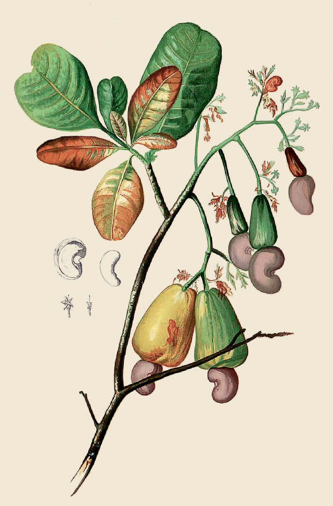 ...Есть сведения, что коренные жители тропических лесов северо-западной части Бразилии не без оснований считали плоды и орехи кешью вкусными и питательными. Оценили их и португальские завоеватели. Местное название орехов — кажу — происходит от португальского caju, которое в английском языке превратилось в сashew, а в русском языке закрепилось уже как калька с английского «кешью». Деревья, на которых растут кешью, португальцы назвали cajueiro. Карл Линней присвоил растению ботаническое имя анакардиум западный (Anacardium occidentale) и поместил его в семейство Сумаховые (Anacardiaceae), где оно оказалось в приятном соседстве с фисташками и манго. В названии «анакардиум» явно прослеживается его происхождение от греческого слова, означающего сердце, возможно, потому, что Линней имел в виду оригинальную форму плодов дерева.