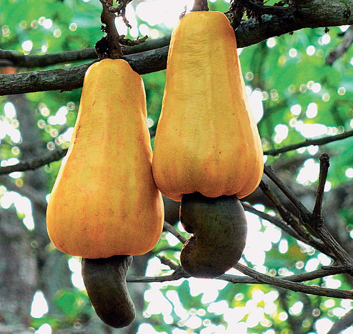 Плоды на дереве выглядят довольно необычно. Они состоят как бы из двух частей. Из крупной мясистой цветоножки жёлтого, оранжевого или красного цвета образуется съедобный ложный сочный плод, а на его верхушке располагается настоящий односемянный плод, который, с ботанической точки зрения, и есть орех. Он имеет твёрдый деревянистый околоплодник, называемый в быту той самой скорлупой, которую грызла белка на острове Буяне, в царстве славного Салтана. Внутри скорлупы ореха комфортно располагается семя, которое часто называют ядром: