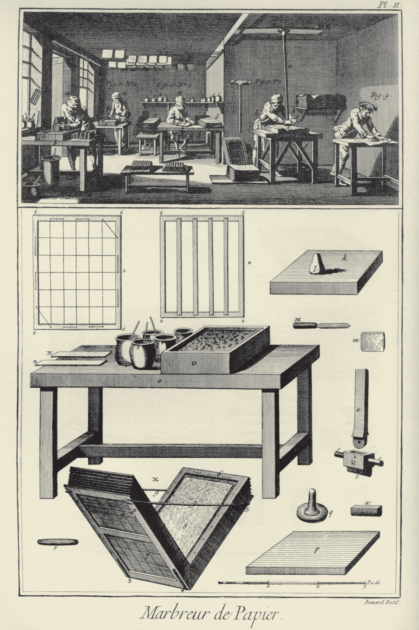 В оформлении книг издавна использовали пёструю бумагу ручной выделки. Называется она мраморной из-за внешнего сходства с этим камнем. От английского слова marble (мрамор) происходит современное название процесса её изготовления — марблинг. Первое марблинговое производство было основано в Венеции в XVI столетии. Считается, что в Европу это искусство пришло с Востока.
