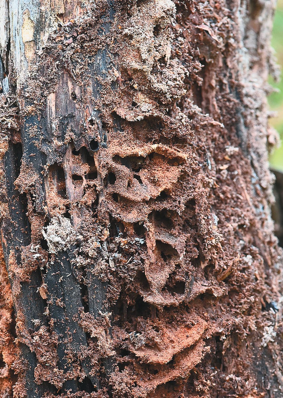 Вслед за слизевиками я нашёл древесное гнездо муравьёв лазиус, скорее всего, чёрного садового муравья (Lasius niger). Эти муравьи встречаются повсюду в Европе, доходят до центральной Сибири и Монголии. В садах могут вредить, разводя тлей.