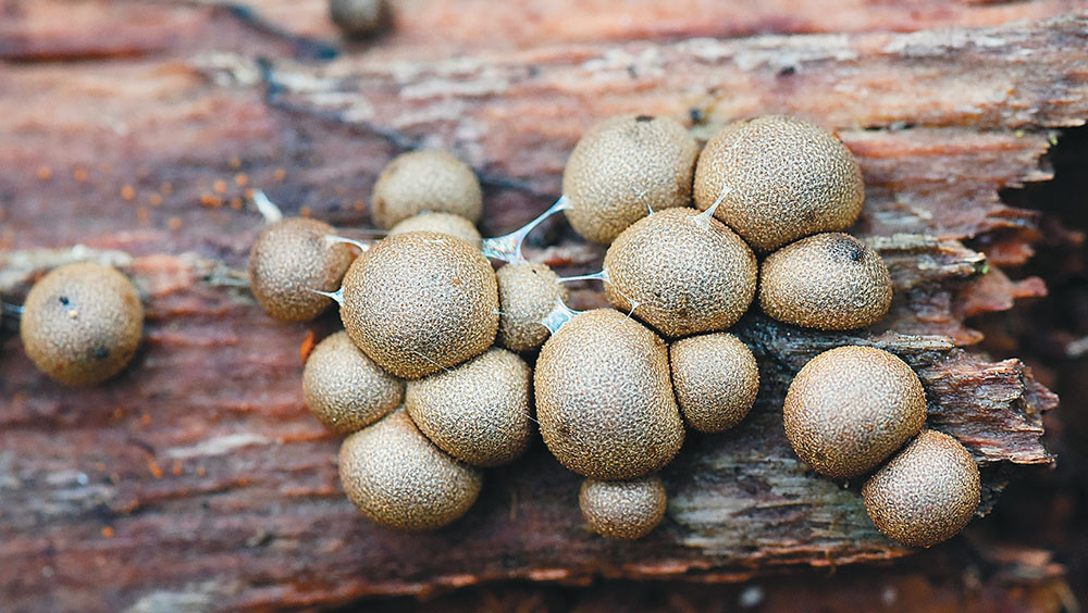 Лес кажется пустым и безжизненным. Пасмурно, для фотоохоты темновато. Но листья частично облетели, и внизу стало светлее. Никого из моих подопечных пока не видно. Зато на старом пне картинно расположились коричневые шарики миксомицетов, или слизевиков. Они похожи на созревшие грибы дождевики — «волчий табак». Действительно, замеченные шарики — плодовые тела, и в них, как и в грибах, находятся споры. Но на этом сходство заканчивается. Хотя слизевиков и описывают в «Жизни растений» рядом с грибами, эти организмы занимают промежуточное положение между растениями и животными. Споры, что находятся в плодовых телах, разносятся ветром и если попадут во влажную среду (на мокрую подгнившую древесину), прорастут, а если воды нет, могут находиться в неактивном состоянии десятилетиями, не подавая признаков жизни. Из споры выводится микроскопически малый одноклеточный гаплоидный (с половинным набором хромосом) организм, иногда несколько. И тут начинаются удивительные вещи. Из исходной споры может вывестись или так называемая зооспора — плавающий жгутиконосец (когда дело происходит в воде), или медленно ползающая амёба — миксамёба (на влажной поверхности). Зооспоры и миксамёбы некоторое время живут, питаются и размножаются делением, как обычные самостоятельные одноклеточные животные. Гаплоидные зооспоры и амёбы фактически являются аналогами наших половых клеток. В определённых условиях они могут переходить к половому размножению — сливаться друг с другом и образовывать диплоидный организм — новую особую амёбу. Она растёт, достигая размеров порой в несколько сантиметров; часто в ней образуется много ядер. Теперь диплоидная амёба называется плазмодий. Он может ползать (со скоростью до нескольких сантиметров в час), а когда приходит срок, устремляется к свету, забирается повыше и образует плодовые тела со спорами, которые и попали на мою фотографию. По этим плодовым телам миксомицет довольно легко различить. На фото ликогала древесная (Lycogala epidendrum). А вот плазмодий у ликогалы — кораллово-красный, порой напоминающий бесформенный кусок слизи. Уж какой, казалось бы, обычный объект. Но многого о слизевиках мы ещё не знаем, и главный вопрос: растения это или животные?