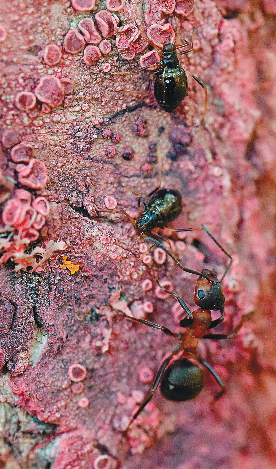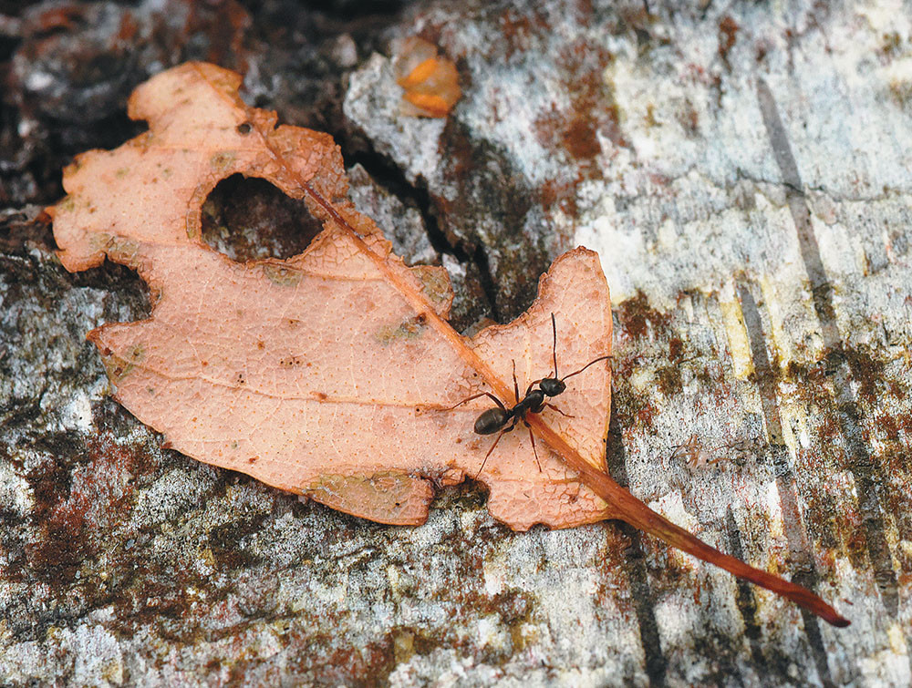 Муравьи — насекомые общественные, живут большими семьями и сооружают гнёзда. В семье общественных насекомых всегда есть одна или несколько маток, которые откладывают яйца, и так называемые рабочие, которые занимаются всем, кроме откладки яиц. Чёрные садовые муравьи строят гнёзда трёх типов: земляные холмики (часто непаханый луг сплошь покрыт такими постройками), норки под плоскими камнями и гнёзда в трухлявой древесине. Я увидел пенёк, возвышающийся над землёй. Летом на пеньке теплее, чем на поверхности почвы в тени под пологом леса. Аккуратно отгибаю кору. Под ней масса камер, построенных в древесной трухе. Летом муравьи приносили сюда и грели расплод — червеобразных личинок и неподвижных куколок. А когда похолодало, муравьи переместились в подземные камеры и галереи — теперь здесь стало теплее.