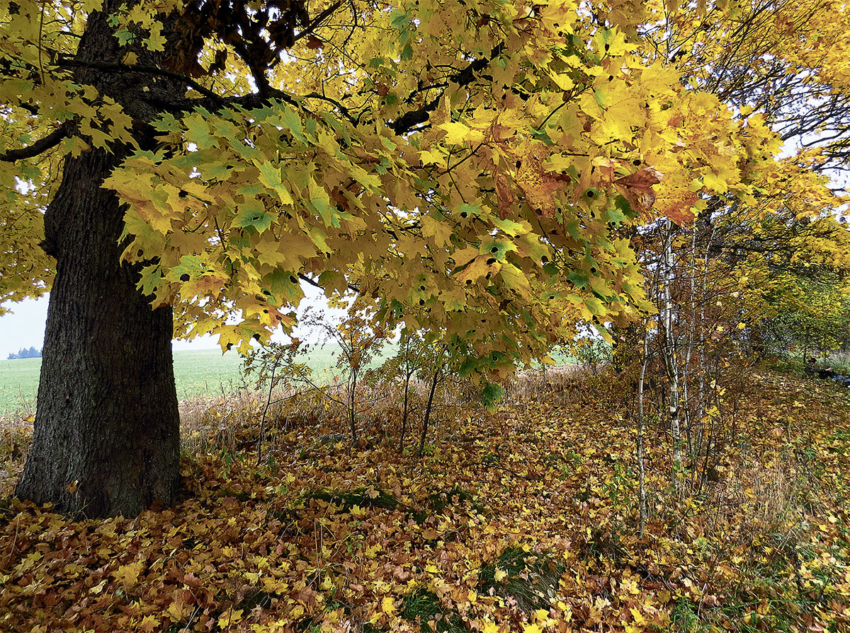 Природа заботится о нас, как хорошая мать о своём дитяти. Чтобы не позволить воцариться полному унынию, особенно в пору мелких, нудных дождей, уходящие в зимний сон деревья веселят нас, разбавляя сплошную зелень лесов чересполосицей ярко вспыхнувших крон. Особенно выделяются солнечным цветом крупные листья орешника и клёна. Постепенно опадая и укрывая толстым шуршащим ковром почерневшую землю, они ещё долго будут освещать наши тропы.