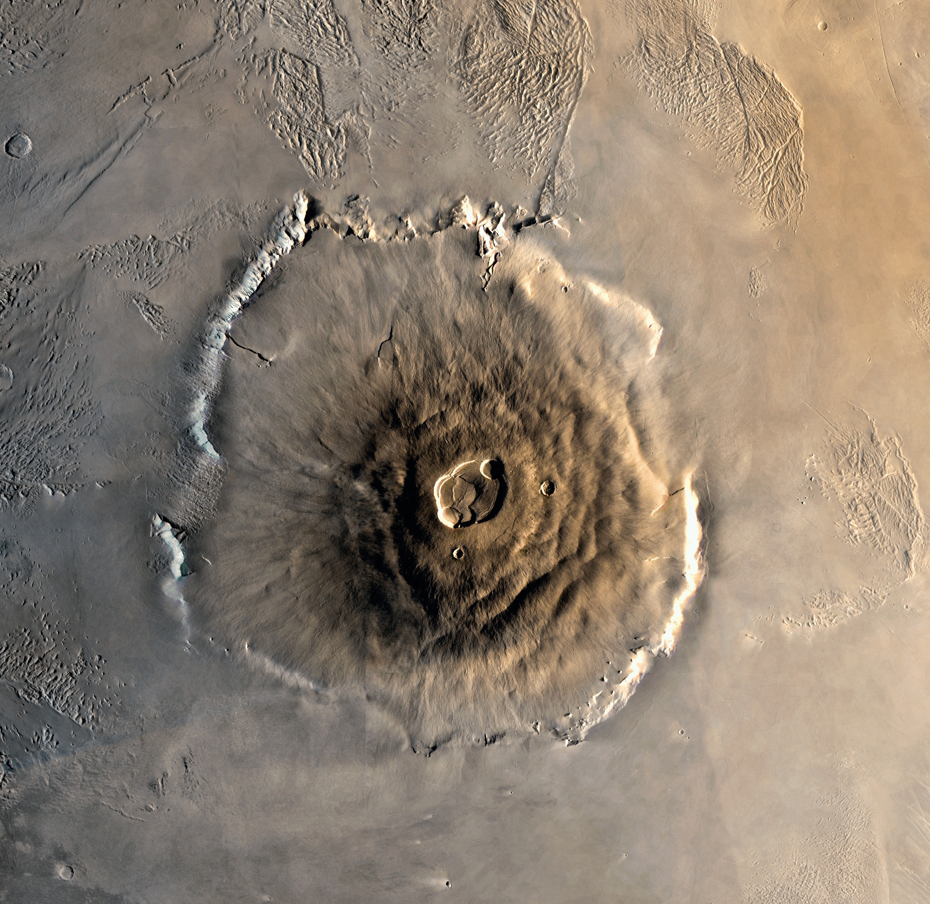 Вулкан Олимп. Изображение составлено из чёрно-белых и цветных снимков, сделанных орбитальным аппаратом NASA «Викинг-1» ещё в 1978 году. Главное различие марсиан-ских и земных вулканов состоит в том, что вулканы на Марсе заметно больше. Объяснить это можно более длительным и активным истечением лавы, а также низкой гравитацией, позволяющей горе расти выше. Другой возможный фактор — неподвижность марсианской коры. На Земле за счёт тектонического движения плит вулканы не могут долго «жить» на одном месте: по мере движения плиты над мантийным плюмом старый вулкан потухает навсегда, а на некотором расстоянии от него рождается новый вулкан. Соответственно, время жизни одного вулкана ограничивается временем, в течение которого из него извергается лава, не позволяющая ему сильно вырасти по сравнению с марсианскими «везувиями». Иллюстрация: Jody Swann/Tammy Becker/Alfred McEwen, USGS, NASA