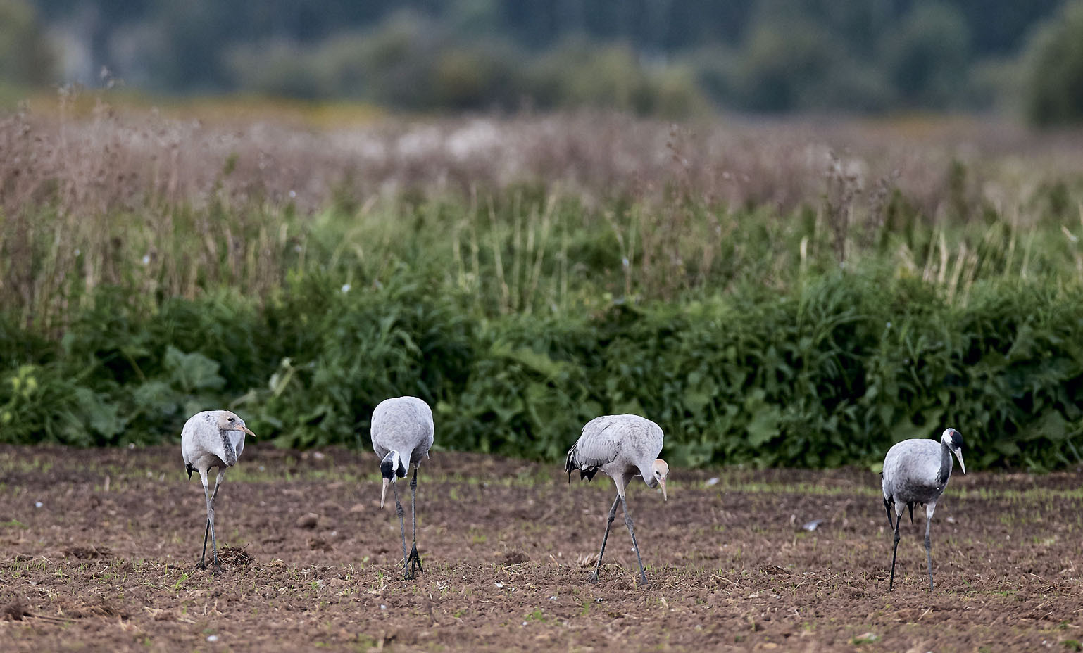 Так что надо как следует подумать, стоит ли беспокоить этих скрытных птиц ради даже очень красивых картинок. Однако не всё так безнадёжно. Не менее эффектные кадры и интересные наблюдения можно получить в другой период жизни серых журавлей — в самом начале осени. Как только птенцы подрастут и «станут на крыло», вся семья покинет болотные угодья и переместится на кормовые площадки. А площадки эти — не что иное, как поля, засеянные сельскохозяйственными культурами. После их созревания и уборки урожая поля оказываются «во владении» журавлей.