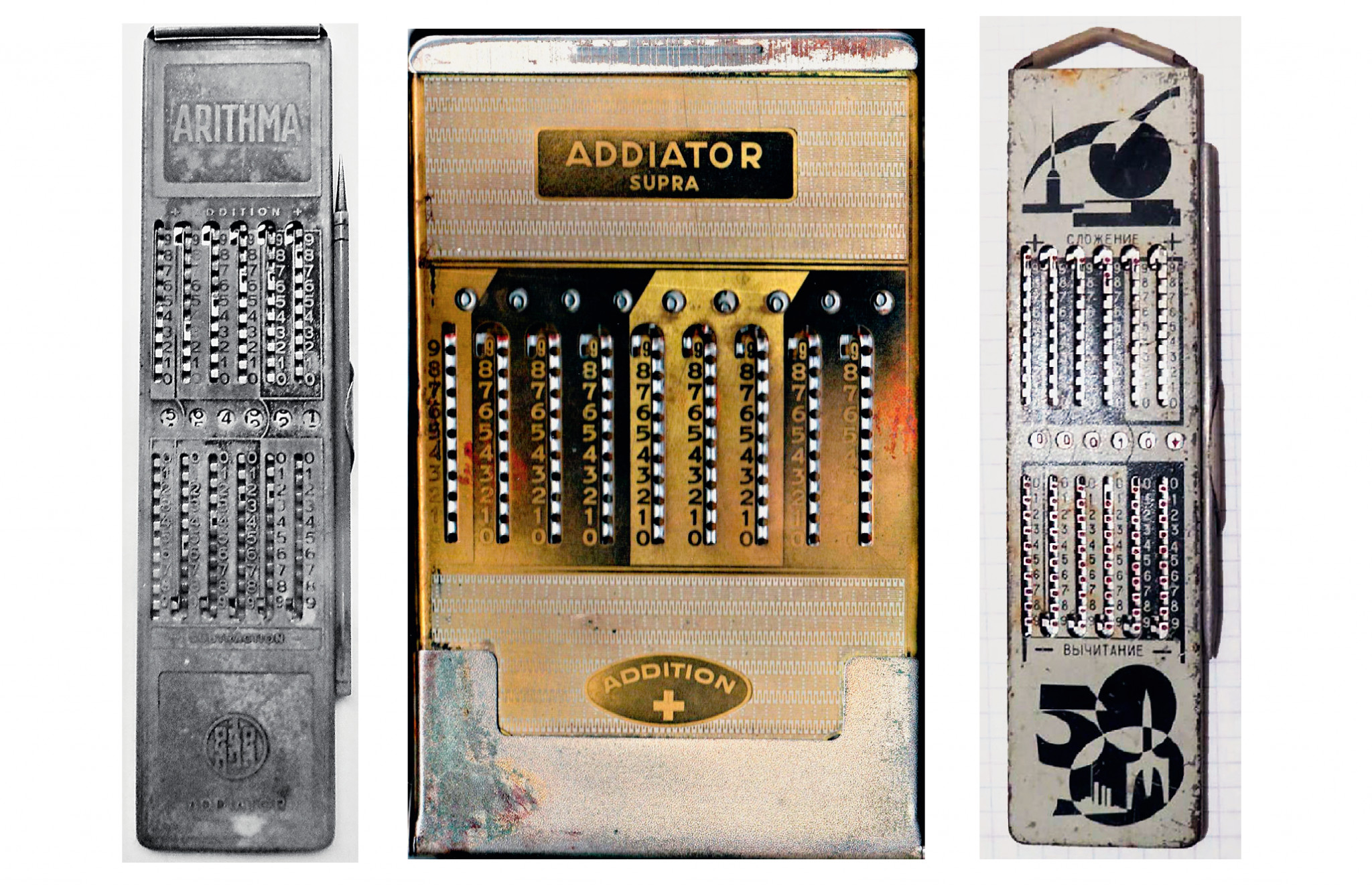 К нам попало три слегка загадочных предмета на эту тему. Хотя, конечно, за последние пару веков их было гораздо больше, вспомнить хоть памятный каждому опытному бухгалтеру арифмометр «Феликс».