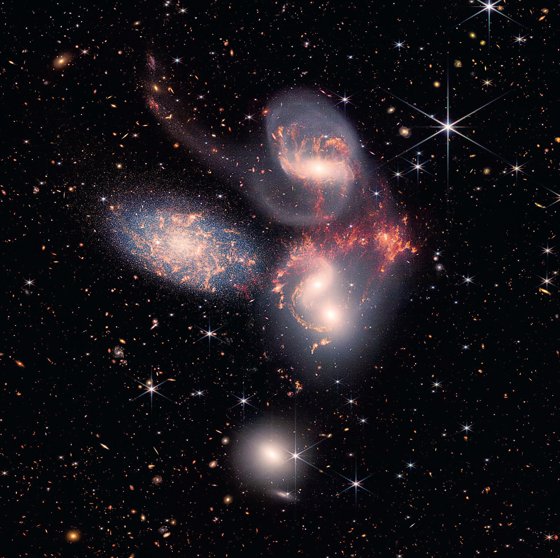 На другом изображении можно увидеть Квинтет Стефана — группу из пяти галактик в созвездии Пегаса. Четыре из них находятся рядом, на расстоянии около 290 миллионов св. лет от Земли, и взаимодействуют. Пятая, самая левая, расположена значительно ближе к нам — до неё около 40 миллионов св. лет. Близость этой группы, по астрономическим меркам, даёт астрономам редкую возможность детально изучать слияние галактик и их воздействие друг на друга, приводящее к возмущению в них газа и увеличению звездообразования. Благодаря инфракрасному диапазону, позволяющему смотреть сквозь пыль, и чрезвычайно высокому пространственному разрешению «Уэбб» показывает невиданные ранее детали в данной группе галактик. Это пока самое большое изображение, полученное «Уэббом», размером в одну пятую диаметра Луны. Оно содержит более 150 миллионов пикселей. «Уэбб» также тщательно изучил