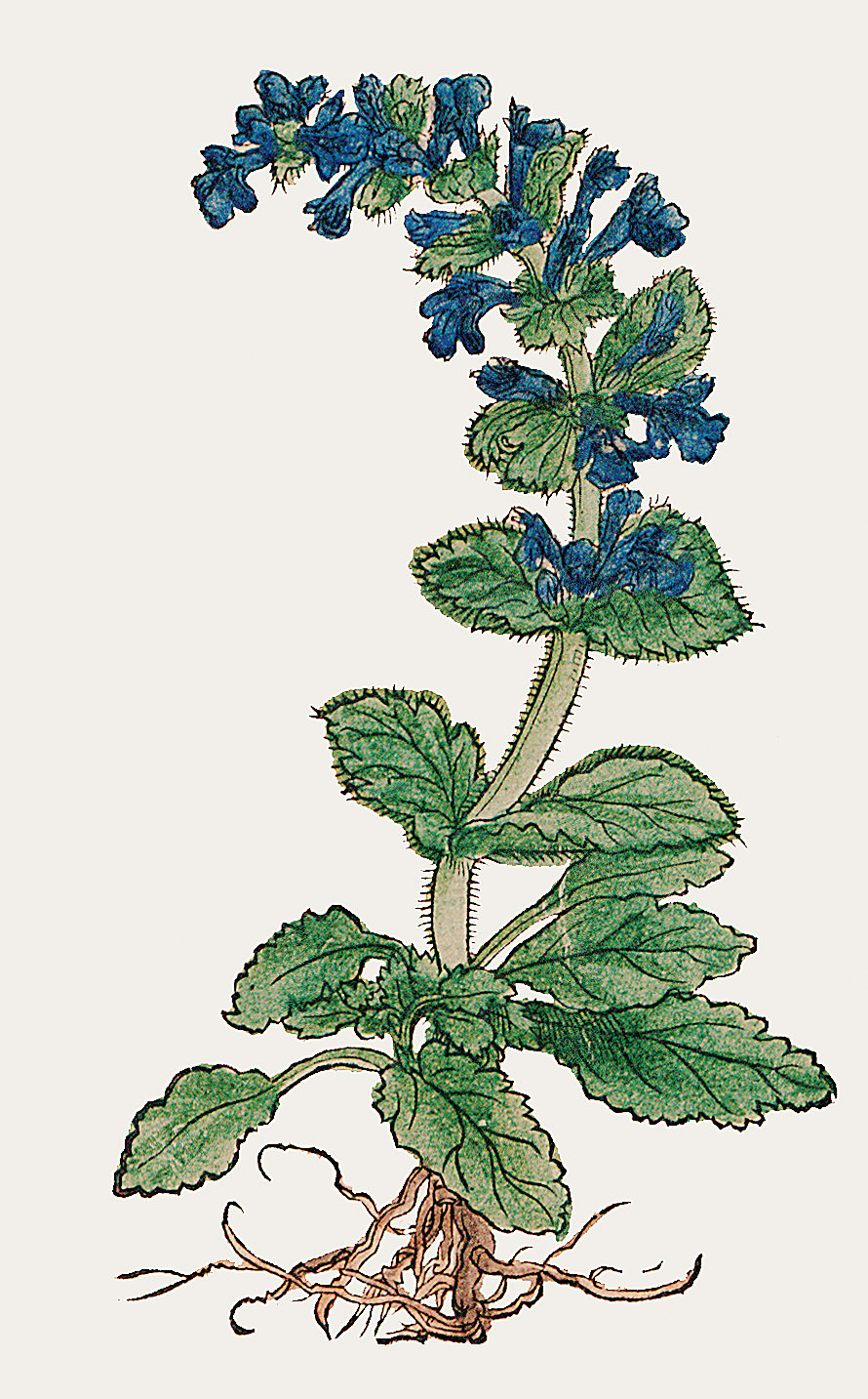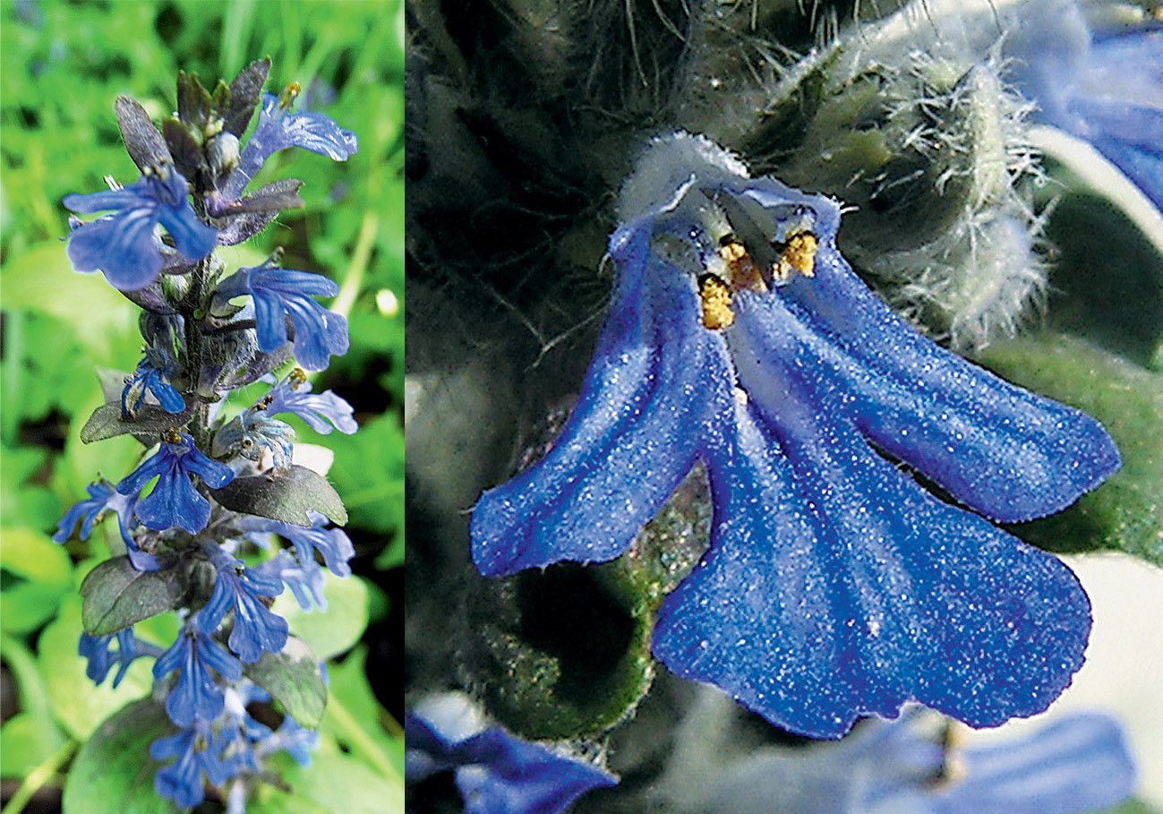 Цветоносные побеги живучки высотой до 35 см. Соцветия колосовидные. Цветки находятся в пазухах листьев, собраны в мутовках по 6—8 штук. Чашечка опушённая. Венчик двугубый, может быть синим, пурпурным, голубым, изредка розовым и белым. Верхняя губа очень короткая и не защищает пыльцу от дождевых капель, поэтому эту функцию выполняют прицветные листья. Нижняя губа длинная, трёхлопастная. Тычинок четыре и они слегка выдаются вперёд. Если посмотреть на цветок в фас, то жёлтые пыльники кажутся глазами на тонких стебельках, с интересом выглядывающими из трубки венчика, будто улитка из раковины.